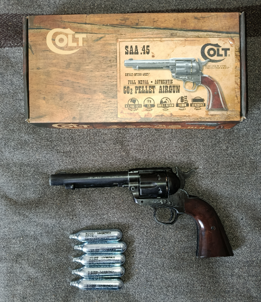 Angeboten wird ein UMAREX Legends Colt Single Action Army SAA CO2 Revolver im Kaliber 4,5mm. Hier in der Ausführung mit gezogenem Lauf für Diabolos (Art. 5.8320)