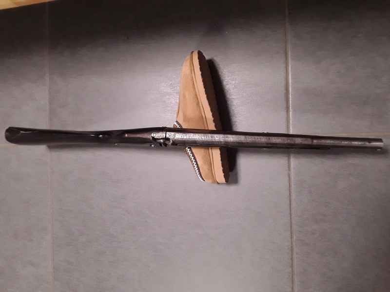 Sie bieten auf eine alte Flinte.Vermutlich französisch. Der Lauf ist abgesägt und der Hahn ist angepunktet, da die Schraube fehlt.