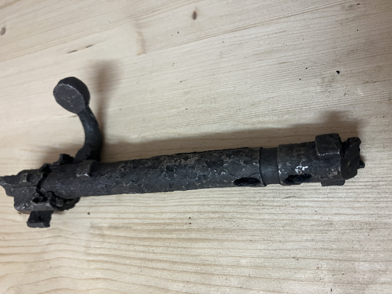 Nur zu Dekozwecken, 45° abgeschliffen und Schlagbolzenkanal verschweißt. Mit Rostumwandler konserviert.