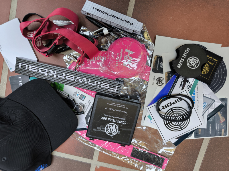 003_Sie steigern auf Produkte verschiedener Firmen, bestehend aus 1x Cap, diverse Aufkleber, 1x Visor, 2x Patch, 1x Schüttelbox, 2x Pellet Saver, Freundschaftsbänder, diverse Kugelschreiber, 2x Brillenputztuch, Korkenzieher, Metermaß klein + groß, 1x Schlüsselband, 2x Pin.