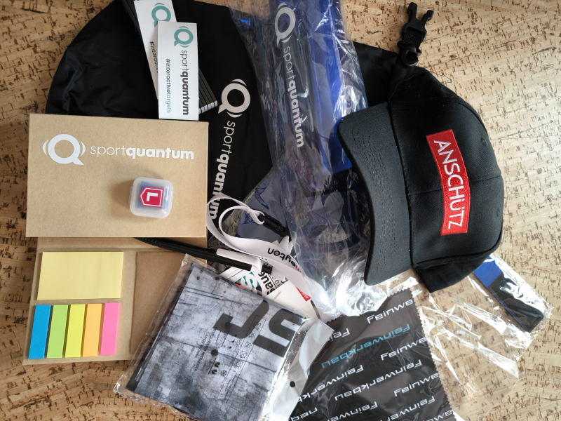 024_Sie steigern auf Produkte der Firma Sport Quantum, bestehend aus 1x Cap, mehrere Aufkleber, 1x Tuch, 1x Schlüsselband, Kugelschreiber, 1x Freundschaftsband, 1x Trinkflasche, 1x Metermaß, 1x Brillenputztuch, 1x Notizblock, 1x Visor und einen Aufbewahrungsbeutel.