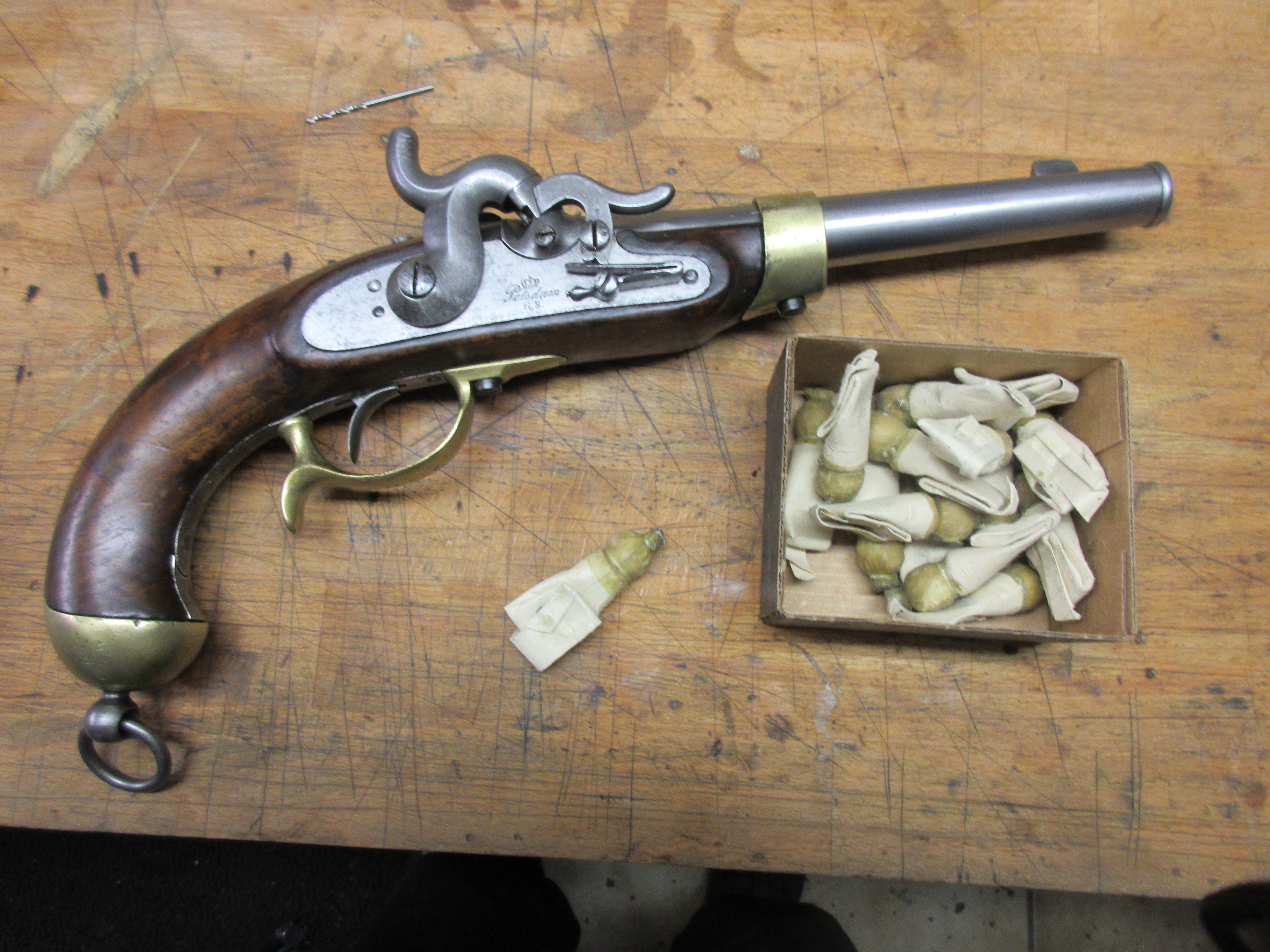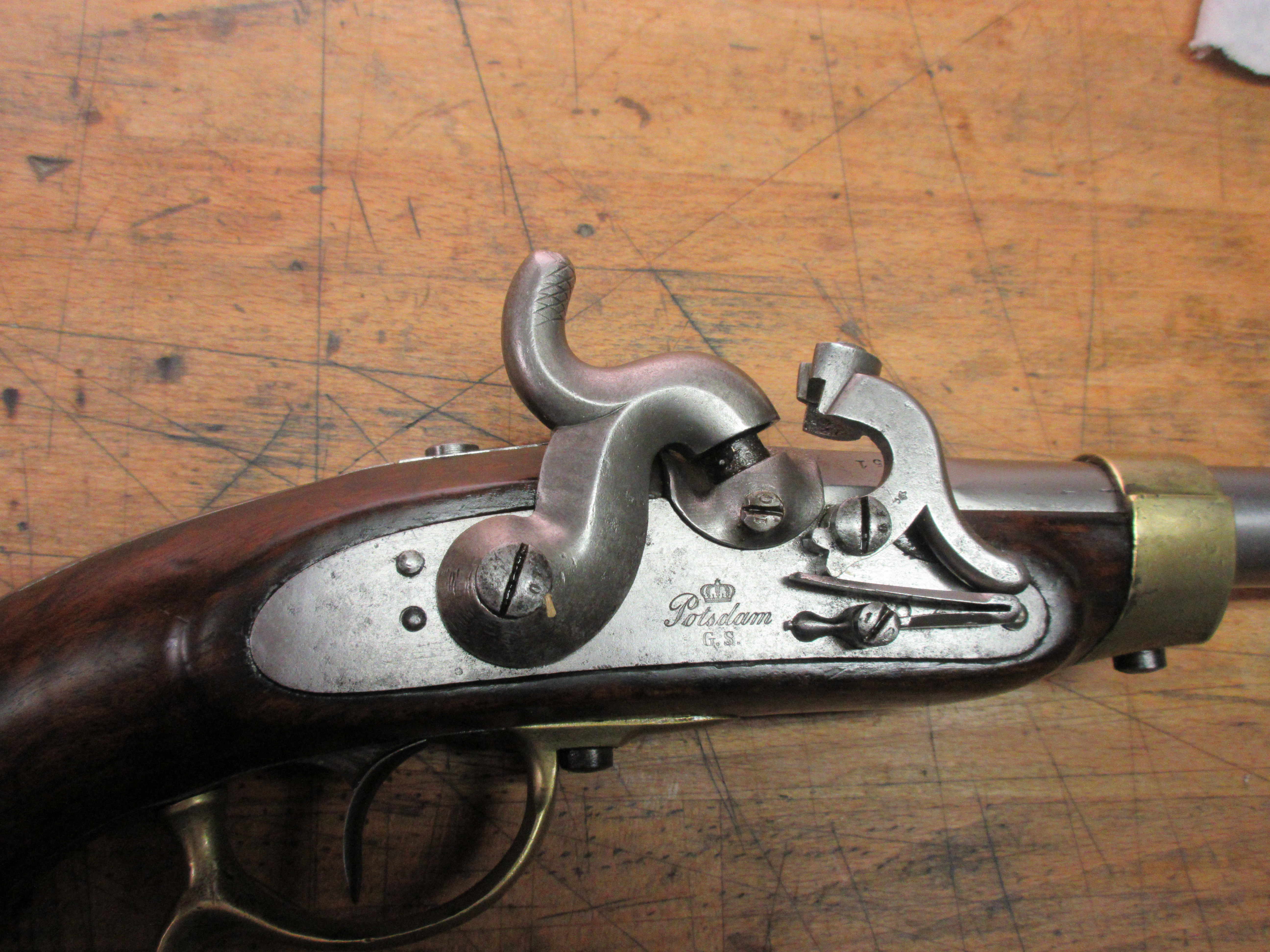 Originale preussische Pistole M/50 von 1851, Hersteller Potsdam G.S. mit Truppenstempel. Die Waffe ist komplett nummerngleich, lediglich die Kreuzschraube ist nicht auf dem Kopf, sondern auf dem Schraubenschaft nummerngleich zu den anderen Schrauben gestempelt. Der Zustand der Wafffe ist überdurchschnittlich gut in schussbereitem Zustand (hierzu übernehme ich weder Grarantie noch Gewährleistung, die abgebildeten Papierpatronen gehören NICHT zum Lieferumfang)! Kein Rost, keine nenneswerten Rostnarben. Ich habe die Waffe nach Erhalt lediglich geölt, weder "geputzt" noch sonstwie "geschönt"! Die Bilder sind Bestandteil der Artikelbeschreibung! Rückgabe innerhalb von 14 Tagen nach Erhalt des Artikels akzeptiert. Fragen zum Artikel werden gerne beantwortet! Versand per DHL, höhere Kosten für Höherversicherung. Rücksendung muss zu gleichen Konditionen wie der Hinversand stattfinden.