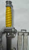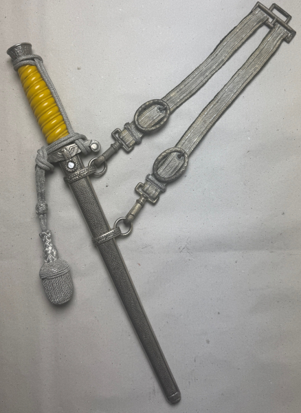 Wehrmacht / Heeres Offiziersdolch mit Gehänge und Portepee: blanke Klinge ohne Hersteller, Ausführung mit maisgelben Griff und Neusilberbeschlägen, Vorkriegsfertigung um 1936. Scheide ohne jegliche Dellen. Adler 100% erhalten, Leicht getragen, guter Zustand.