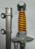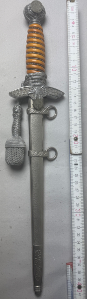 Luftwaffe Dolch für Offiziere mit Portepee: blanke Klinge ohne Hersteller, orangebraunes Griffstück mit intakter Wicklung, Vorkriegsfertigung, Beschläge aus Buntmetall, Scheide vernickelt, Embleme 100% erhalten, mit Münze abgedeckt, guter nur sehr leicht getragener Zustand.