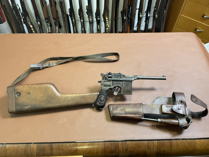 Zum Verkauf steht eine Pistole Mauser C96 im Kaliber 9 mm Luger, mit Holzkasten, Lederholster und Putzstock.