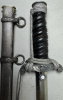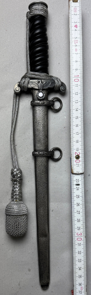 Wehrmacht / Heeres Offiziersdolch mit Portepee: blanke Klinge mit Hersteller "Alcoso Solingen", Ausführung mit schwarzem Griff und Neusilberbeschlägen, Vorkriegsfertigung. Scheide mit leichter Delle. Adler 100% erhalten, Leicht getragen, guter Zustand.