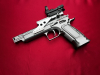 Das an der Pistole montierte Leuchtpunktvisier kann unterschiedliche Leuchtpunkte ( . + * etc.) darstellen in den Farben Grün und Rot. Die Pistole hat leichte Gebrauchsspuren und sie funktioniert einwandfrei. Nur ein paar Mal geschossen, ansonsten nur Vitrinenstück.