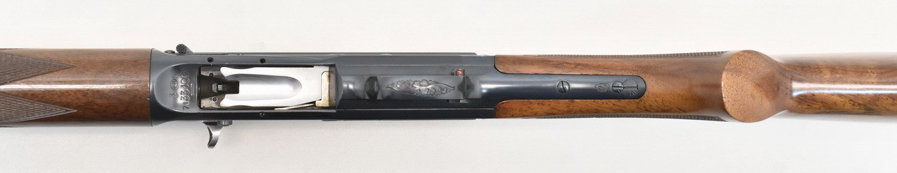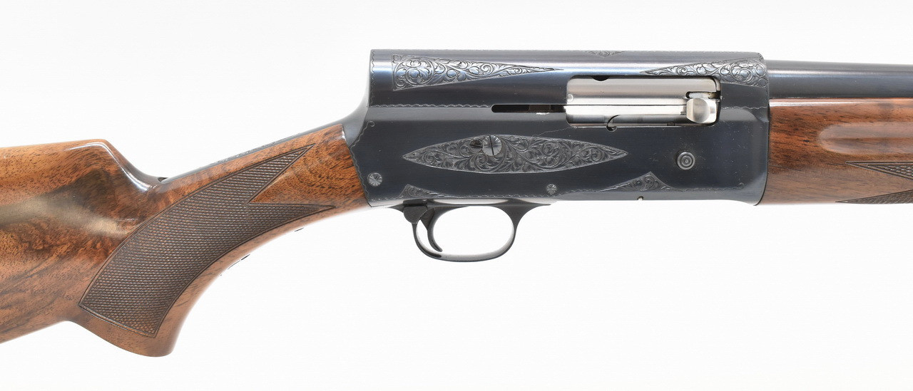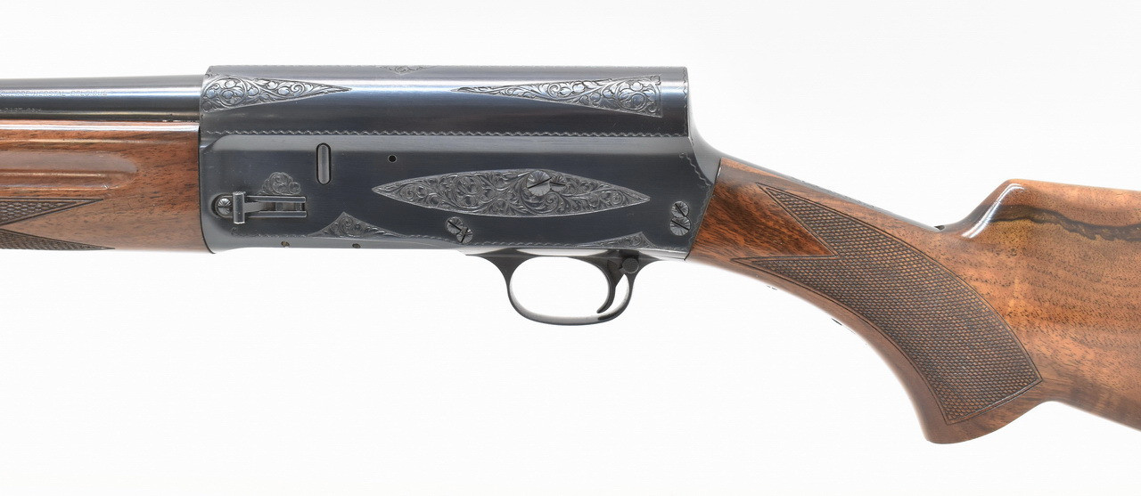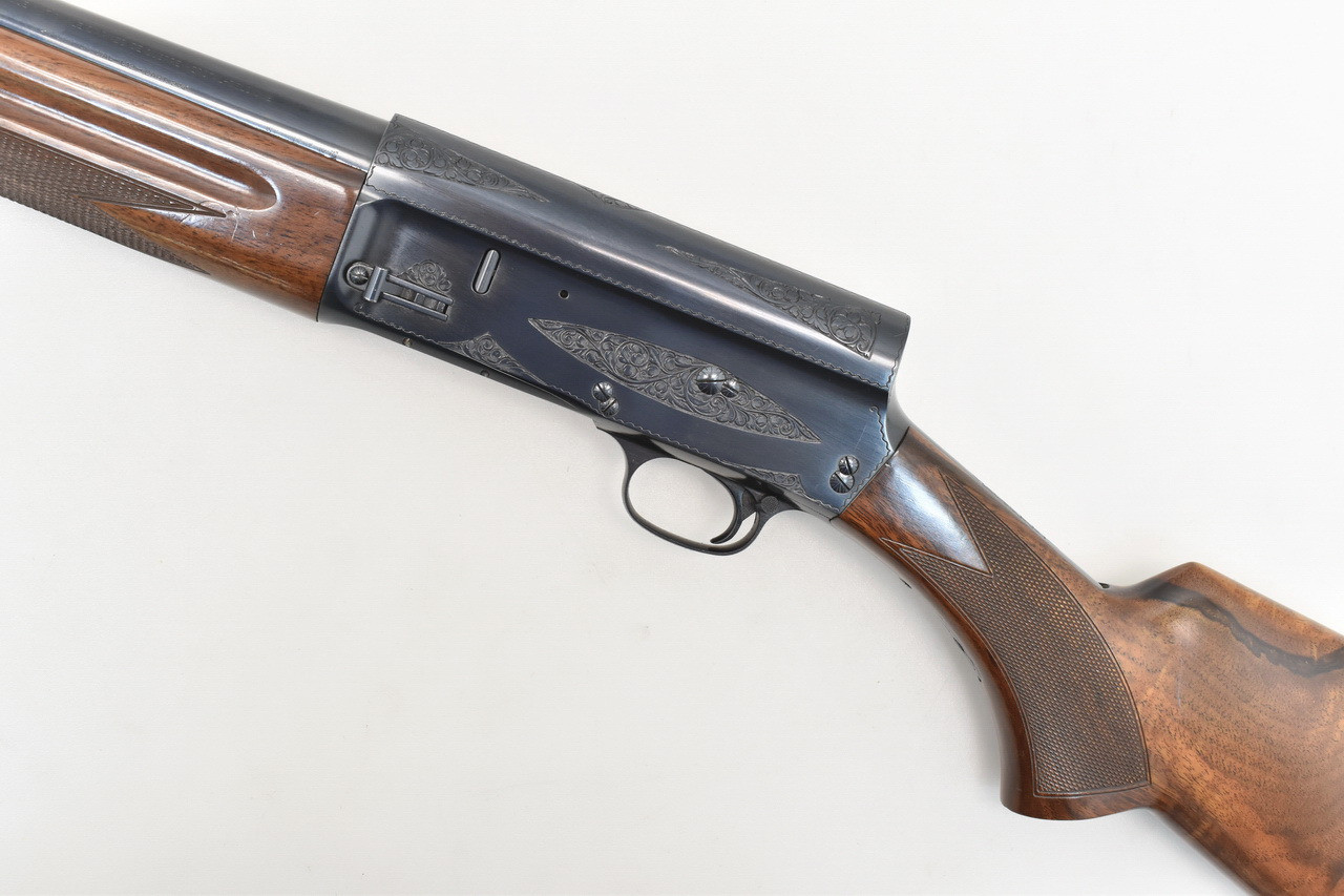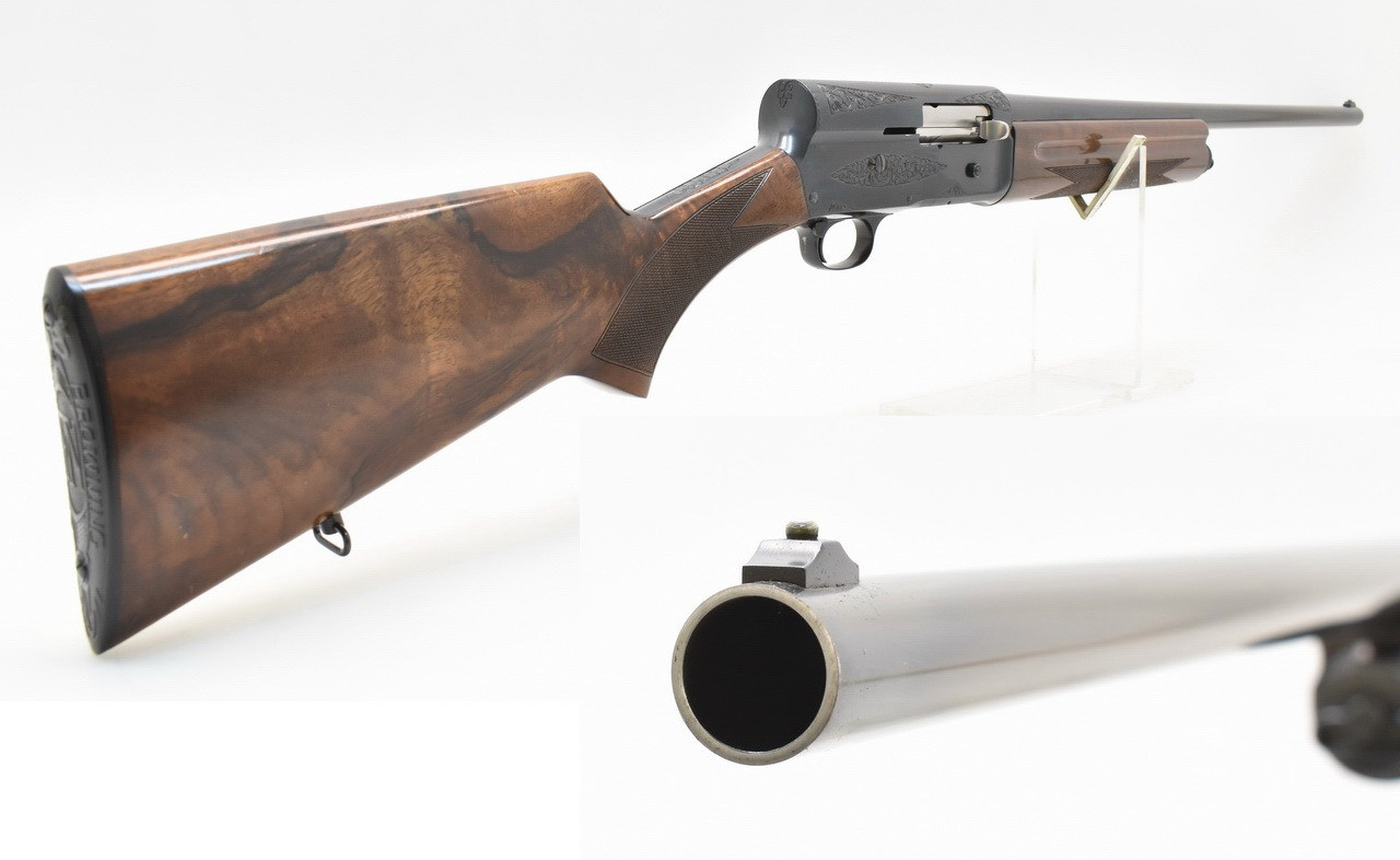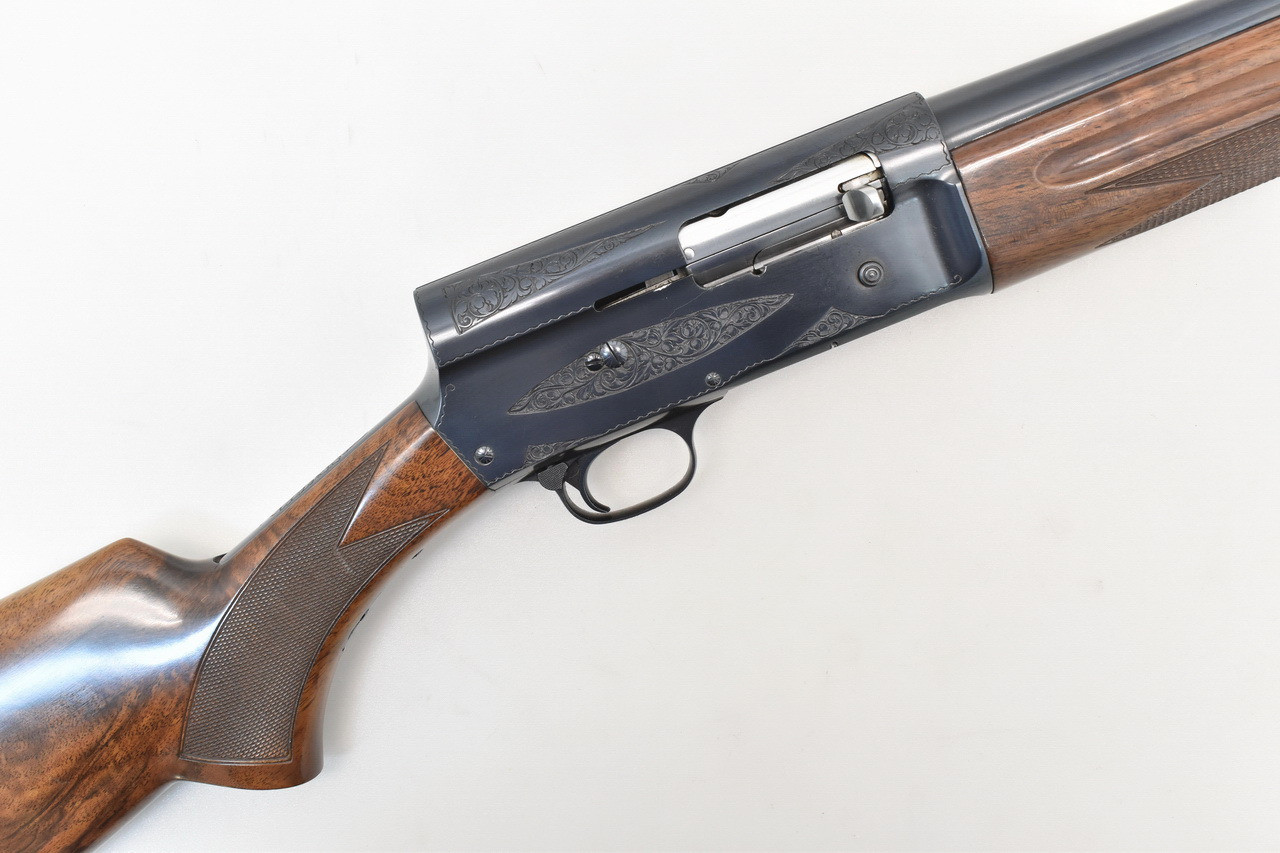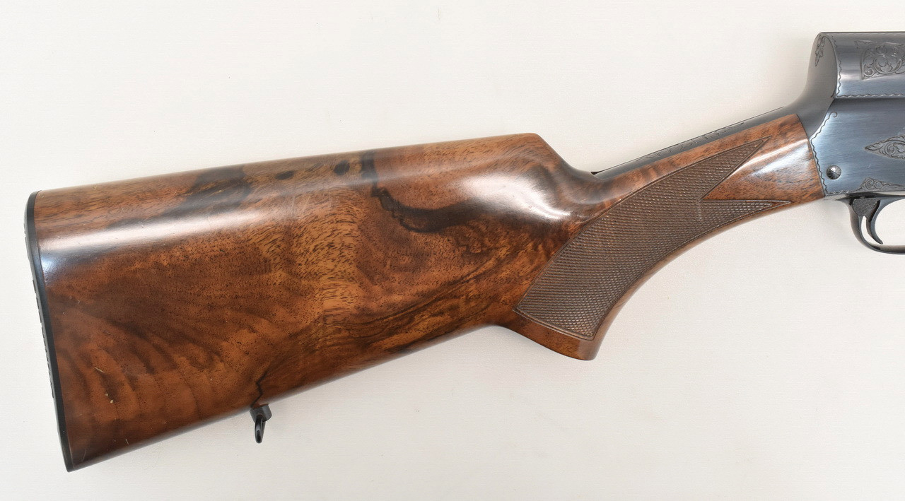 DER Klassiker unter den Jagd - Selbstladeflinten - Die Browning Automatic 5. Hergestellt von der belgischen FN Fabrique Nationale D´Armes de Guerre, Herstal. Brünierter Stahlsystemkasten mit kleiner Gravur. Spiegelblanker 27,5" Vollchoke - Lauf. 362mm langer gerader Schaft mit Pistolengriff ( Schaftlänge gemessen vom Abzug bis zur Mitte der Originalschaftkappe ). Leichte Trage- und Gebrauchsspuren sind vorhanden. Details siehe Bilder.