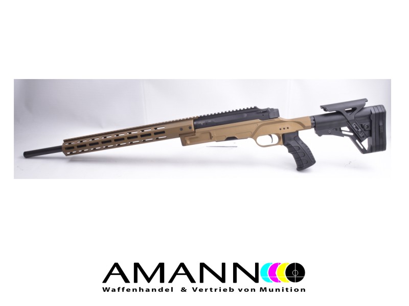 Die Waffe ist in klassischem Schwarz/Sand gehalten. Die HAENEL Repetierbüchse LR/ONE präsentiert sich mit einem ansprechenden und zugleich zweckmäßigen Design.