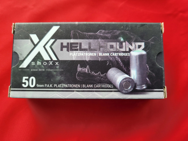 Sie kaufen 1 Dose sind 50 Stück Knallpatronen der Firma Hellhound Cal. 9mm PAK