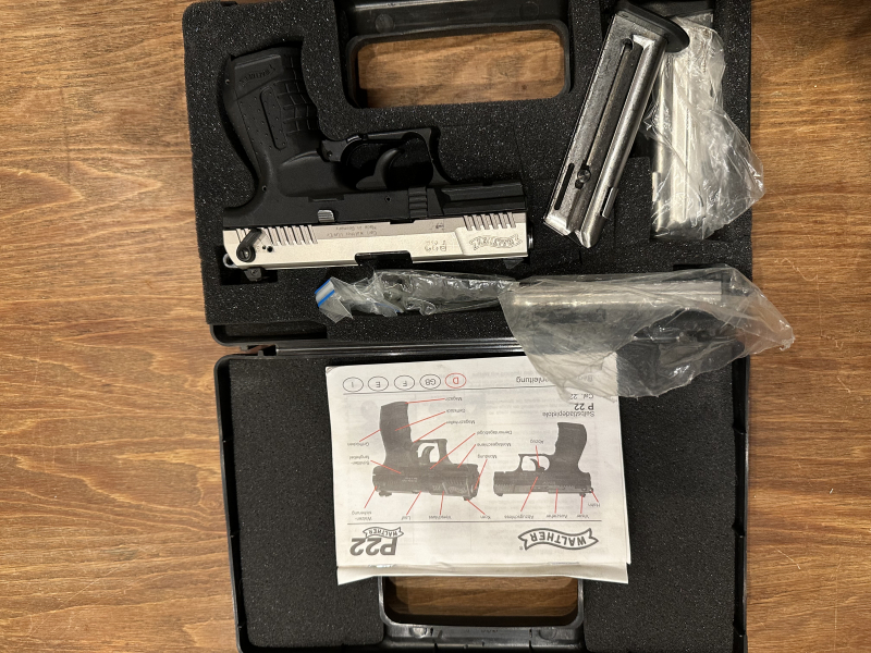 Verkaufe meine Walther P22 Vernickelt mit 3 Magazinen im kaliber 22 lfb und verschiedene Griffrücken.