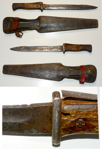Deutsches Bajonett für G98 WK1, auf Knauf Abnahmestempel ansonsten keine Markierung, Klinge etwas rostig, entsprechend den Vorschriften ab 1916 ist die Säge abgeschliffen, aber nicht völlig sondern nur die Spitzen gekappt, das Feuerblech vorn lose, mit einer feldgefertigten Notscheide aus dickem Kernleder