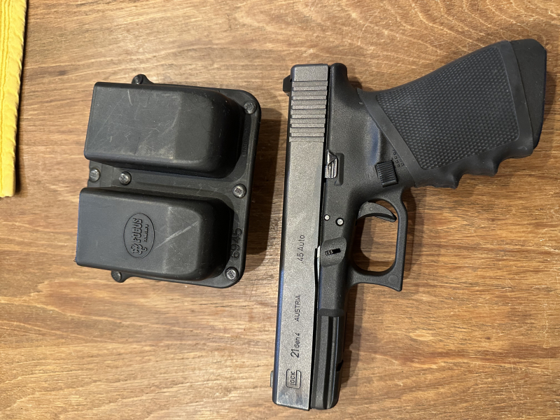 Verkaufe meine Glock 21 Gen 4 mit 3 Magazinen verlängertem Schlittenfanghebel, Vergrößertem Magazindruckknopf, Griff überzug Magazin Tasche und Imi Defense Holster