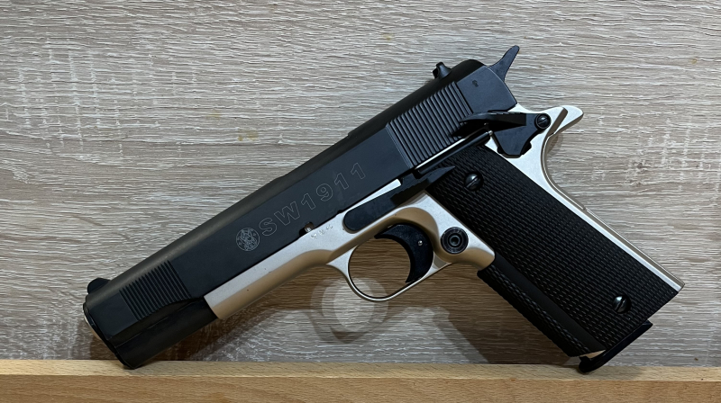 Die S&W 1911 wurde nur in limitierter Auflage von Umarex produziert. Die Pistole ist in einem neuwertigen Zustand, wurde nur zur Probe ein paar mal abgefeuert, ansonsten nicht getragen oder bespielt. Technisch einwandfrei und optisch in Top Zustand. Siehe Bilder. Die langen Bedienelemente wie Schlittenfang - Sicherung und Magazin Druckknopf sind bei der S&W 1911er serienmäßig, nur der Sicherungshebel rechts von der originalen Doppelflügel - Sicherung wurde entfernt.