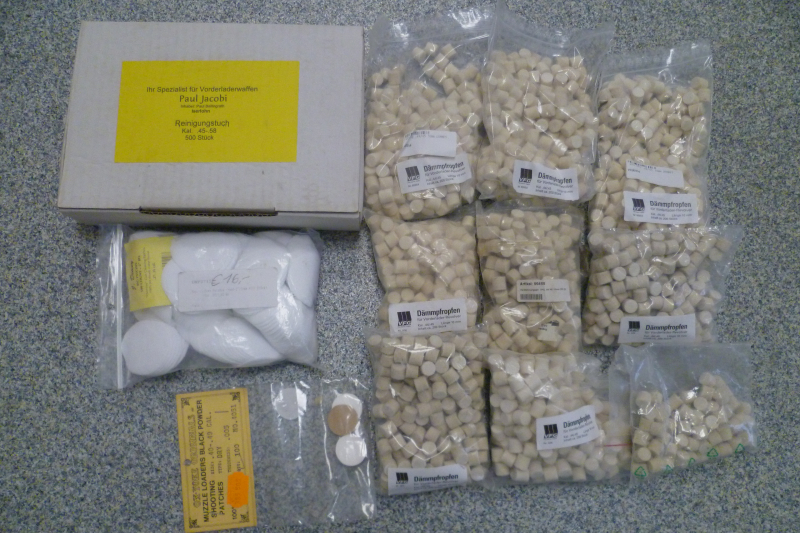 Konvolut Vorderlader Dämmpfropfen .44/.45, Patches, etc.