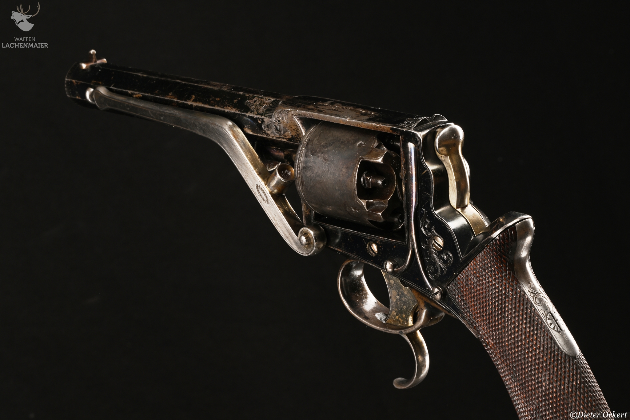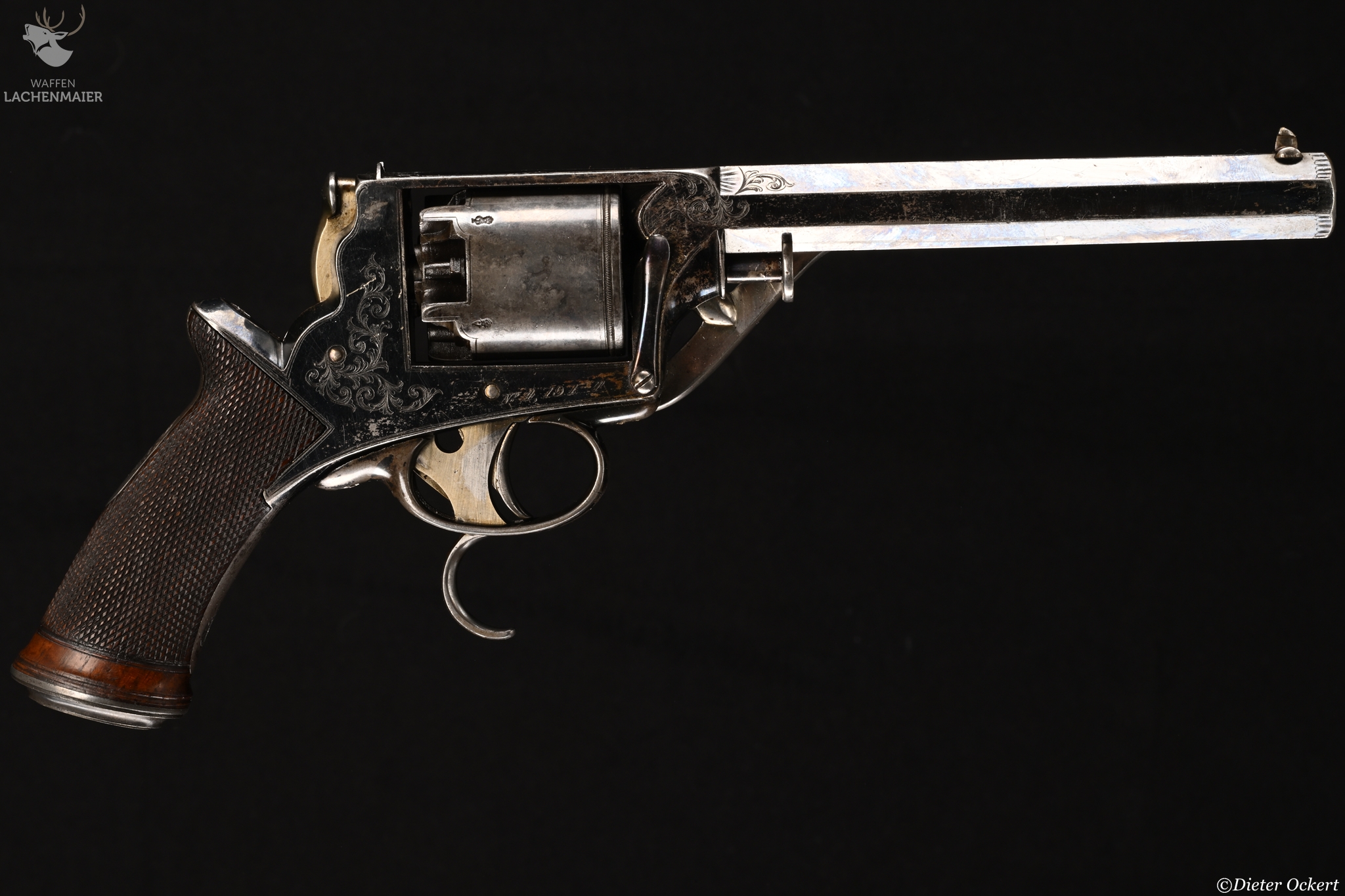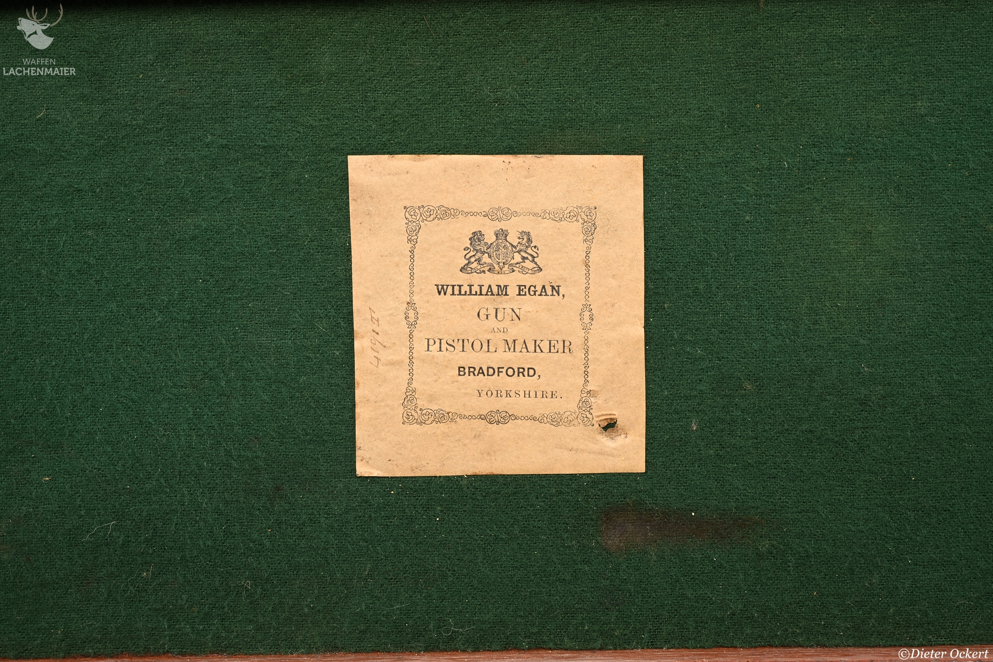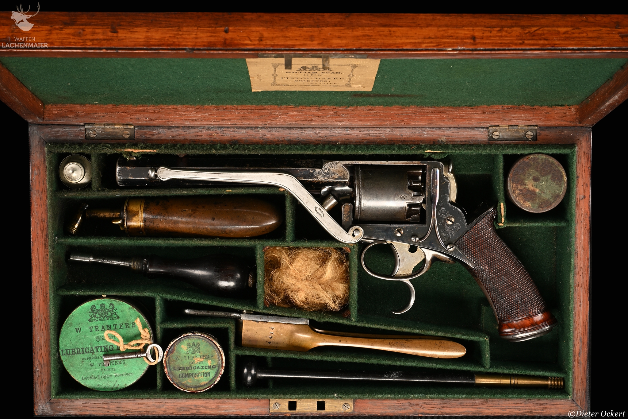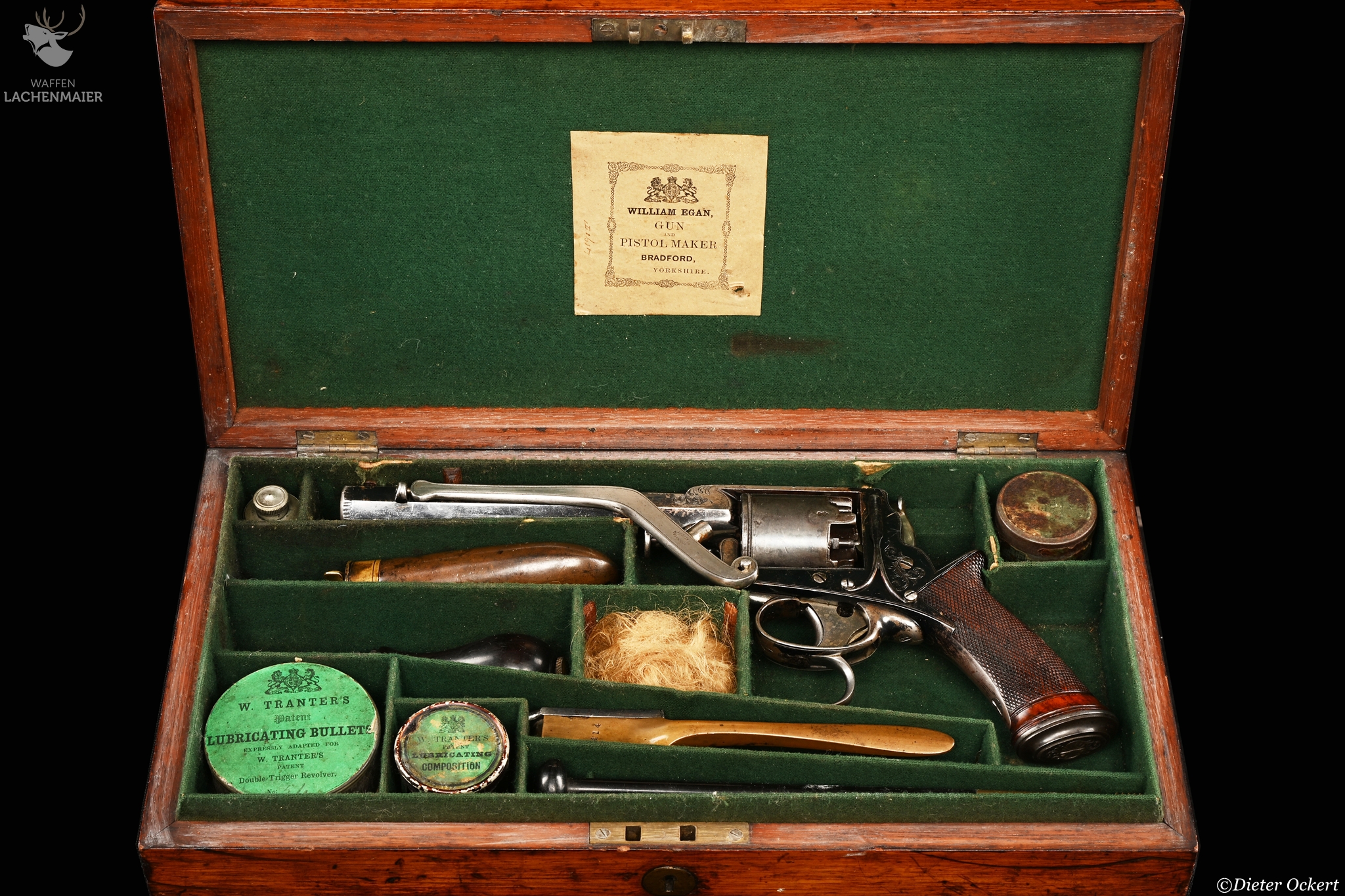 A FINE CASED 54-BORE TRANTER PATENT SECOND MODEL FIVE-SHOT DOUBLE-TRIGGER PERCUSSION REVOLVER RETAILED BY EGAN, BRADFORD serial no. 4191, 11 3/4in. overall, with blued octagonal sighted barrel engraved with a band of foliage at the muzzle, border engraved case-hardened cylinder, blued top-strap signed 'EGAN. BRADFORD', scroll engraved blued frame and trigger-guard, chequered walnut butt, scroll engraved case-hardened pommel, detachable Tranter patent rammer, and much original blued finish, London proof marks, in original lined and fitted mahogany case with accessories including brass double-cavity bullet mould (numbered '4414'), powder-flask and brass-mounted ebony cleaning rod with worm, the lid with William Egan trade label, the exterior with circular brass escutcheon.