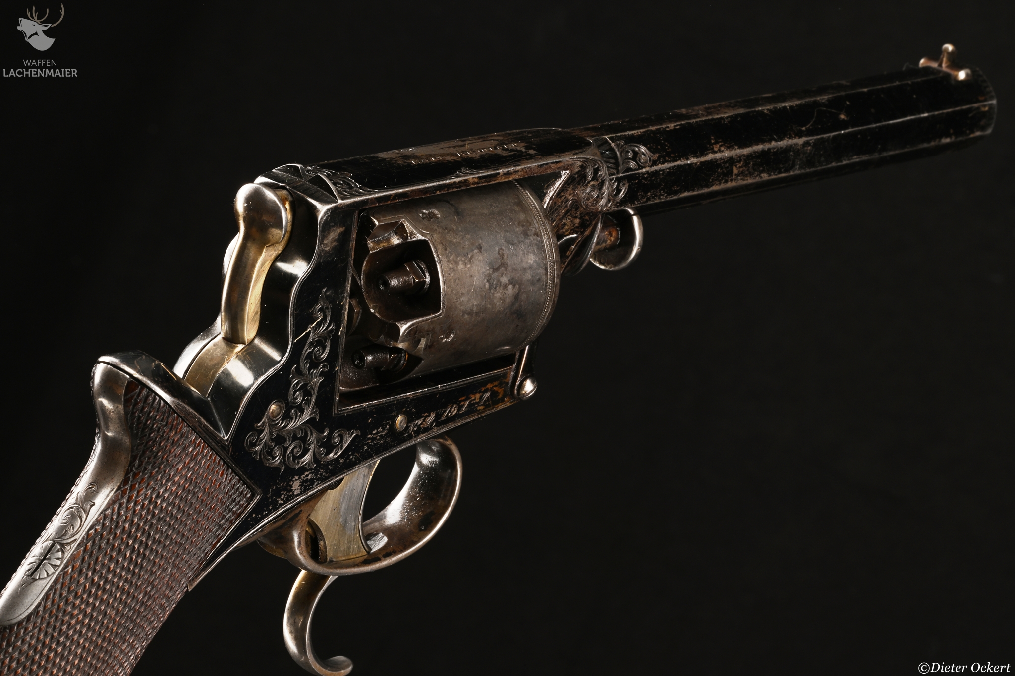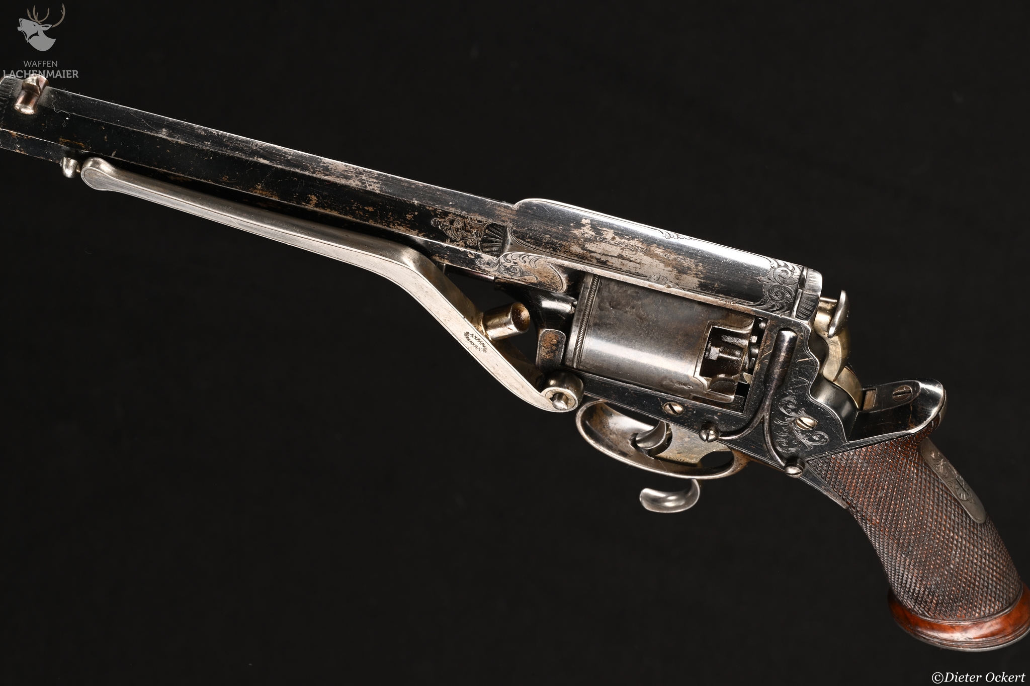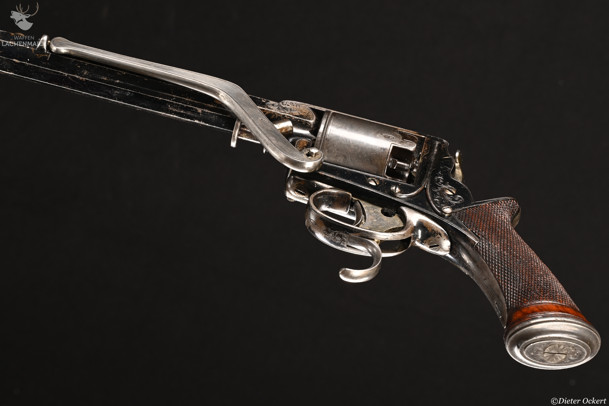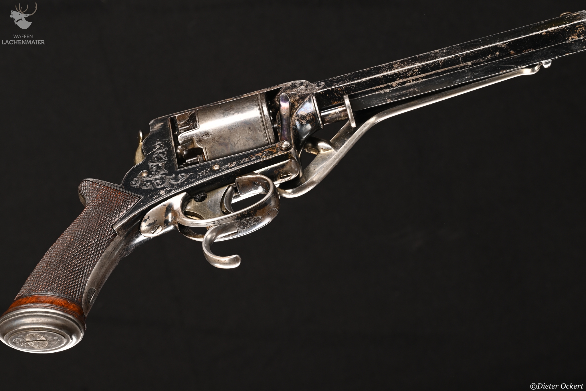 A FINE CASED 54-BORE TRANTER PATENT SECOND MODEL FIVE-SHOT DOUBLE-TRIGGER PERCUSSION REVOLVER RETAILED BY EGAN, BRADFORD serial no. 4191, 11 3/4in. overall, with blued octagonal sighted barrel engraved with a band of foliage at the muzzle, border engraved case-hardened cylinder, blued top-strap signed 'EGAN. BRADFORD', scroll engraved blued frame and trigger-guard, chequered walnut butt, scroll engraved case-hardened pommel, detachable Tranter patent rammer, and much original blued finish, London proof marks, in original lined and fitted mahogany case with accessories including brass double-cavity bullet mould (numbered '4414'), powder-flask and brass-mounted ebony cleaning rod with worm, the lid with William Egan trade label, the exterior with circular brass escutcheon.