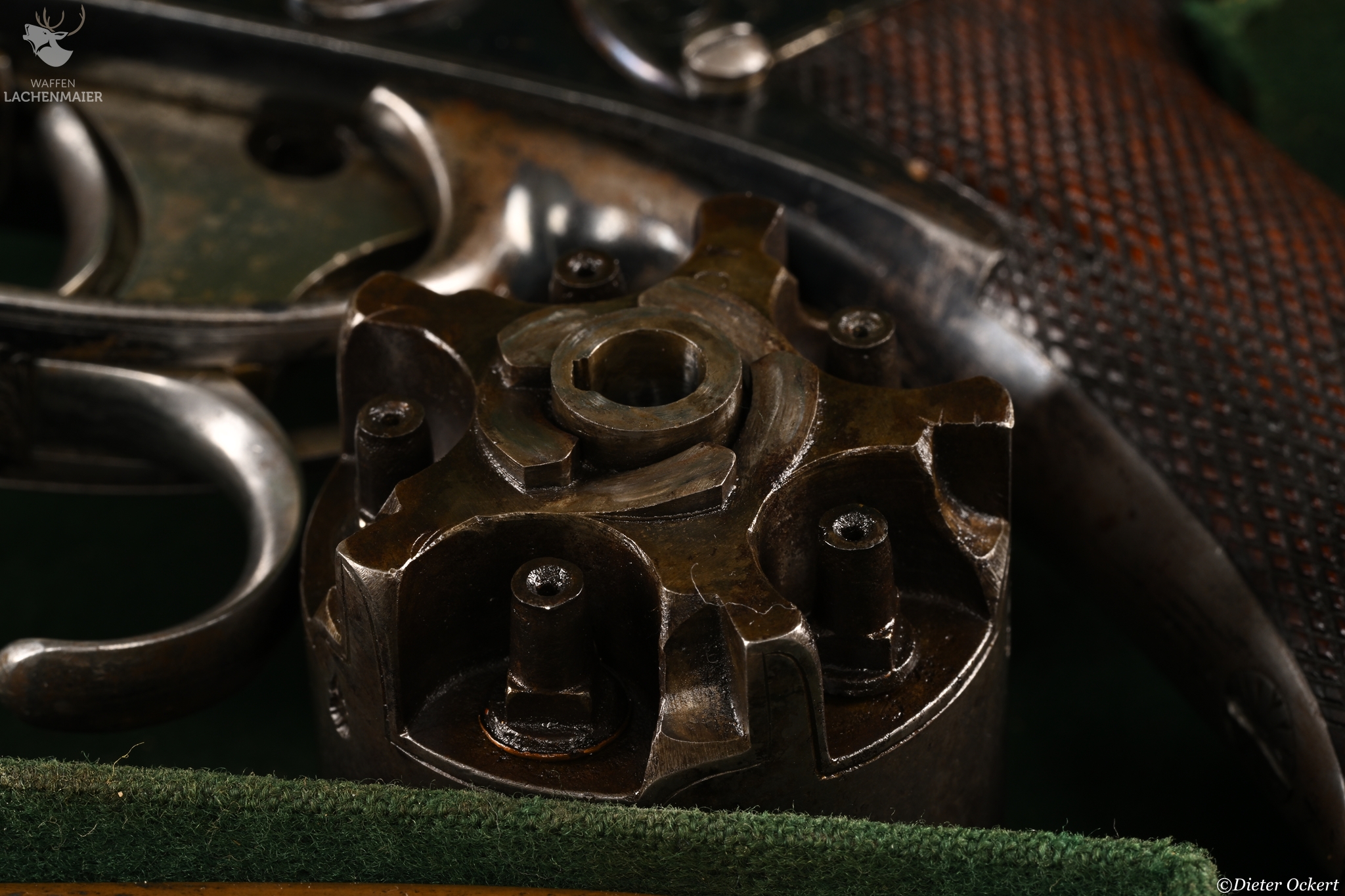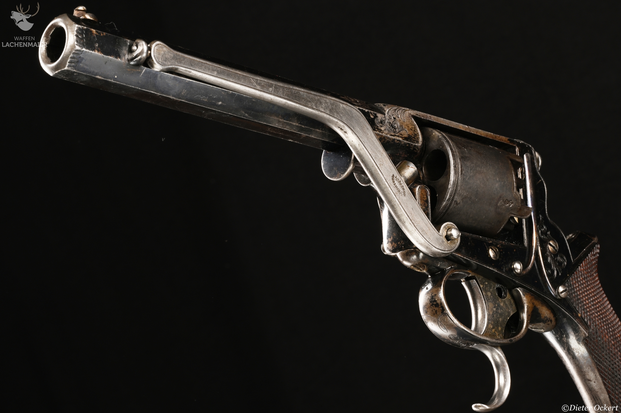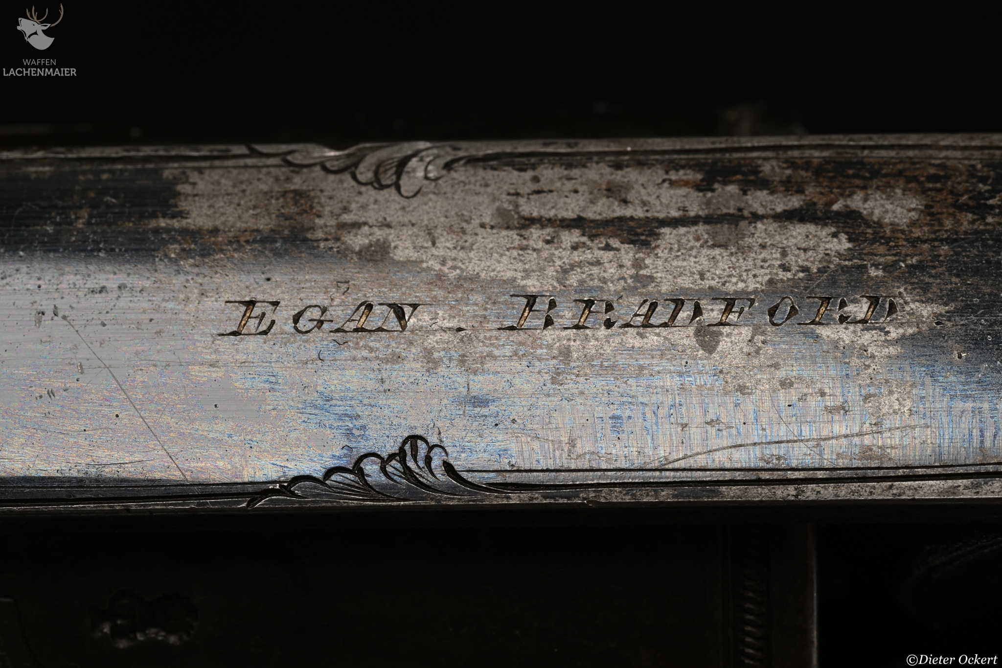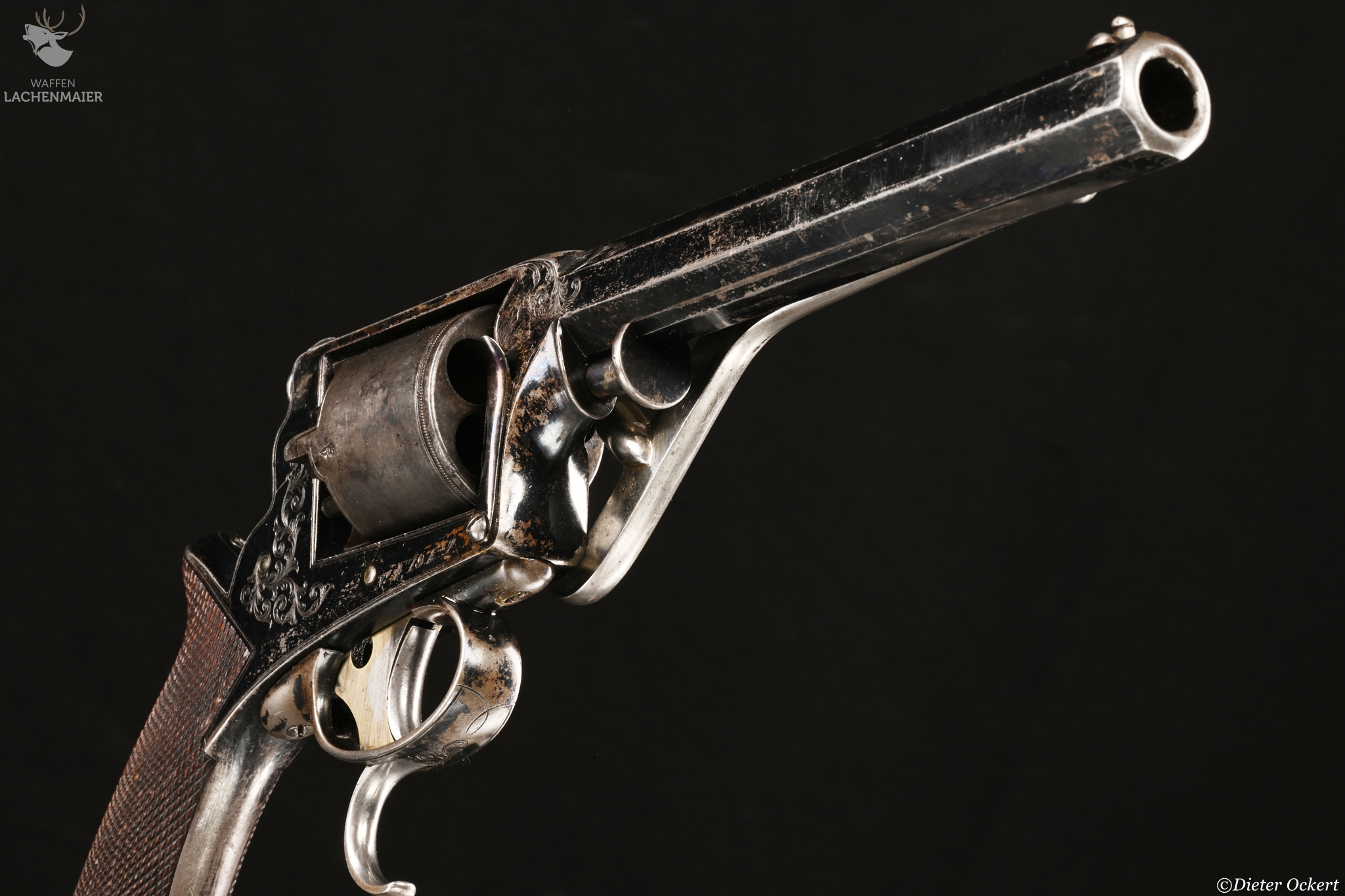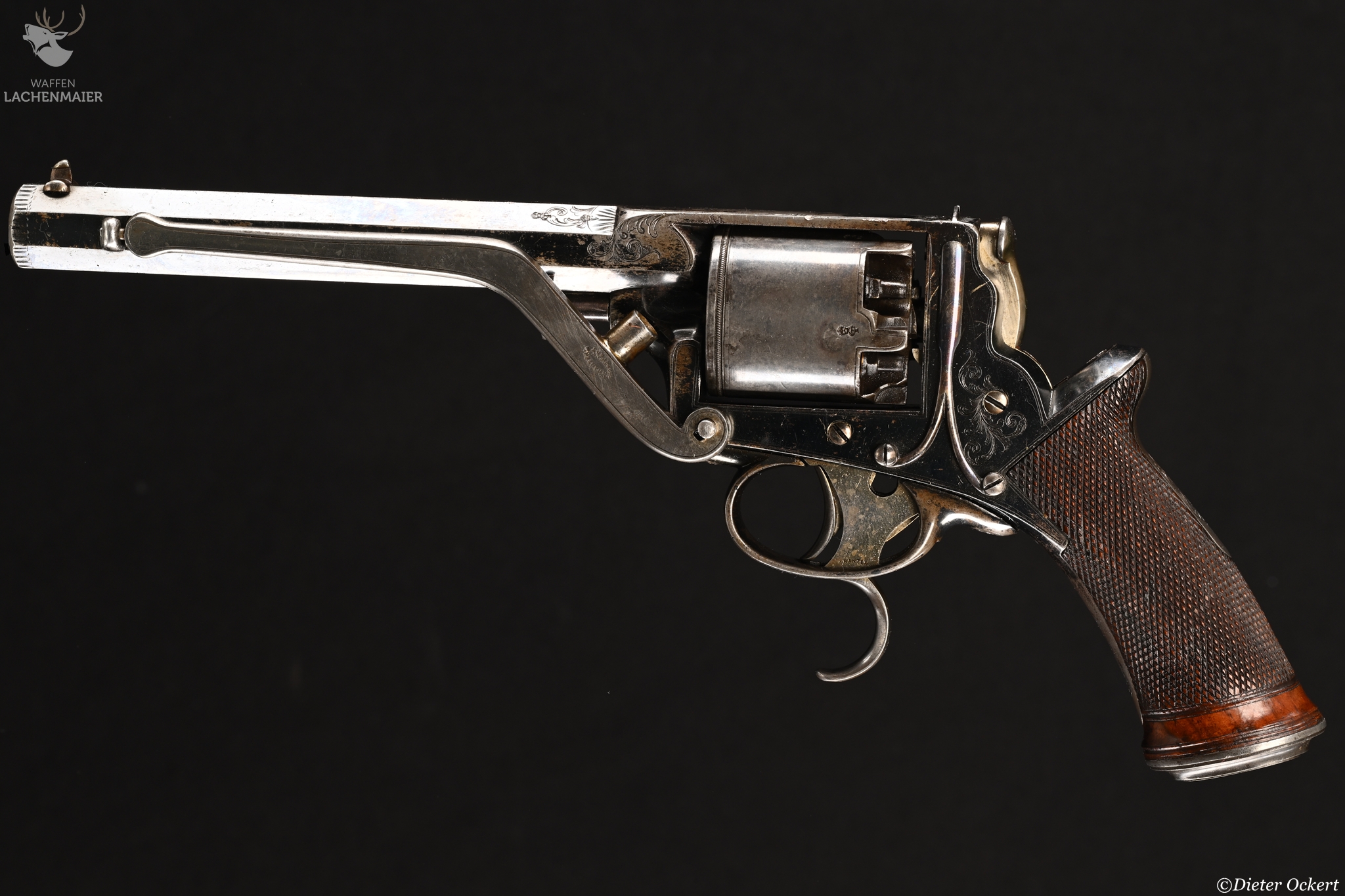 A FINE CASED 54-BORE TRANTER PATENT SECOND MODEL FIVE-SHOT DOUBLE-TRIGGER PERCUSSION REVOLVER RETAILED BY EGAN, BRADFORD serial no. 4191, 11 3/4in. overall, with blued octagonal sighted barrel engraved with a band of foliage at the muzzle, border engraved case-hardened cylinder, blued top-strap signed 'EGAN. BRADFORD', scroll engraved blued frame and trigger-guard, chequered walnut butt, scroll engraved case-hardened pommel, detachable Tranter patent rammer, and much original blued finish, London proof marks, in original lined and fitted mahogany case with accessories including brass double-cavity bullet mould (numbered '4414'), powder-flask and brass-mounted ebony cleaning rod with worm, the lid with William Egan trade label, the exterior with circular brass escutcheon.