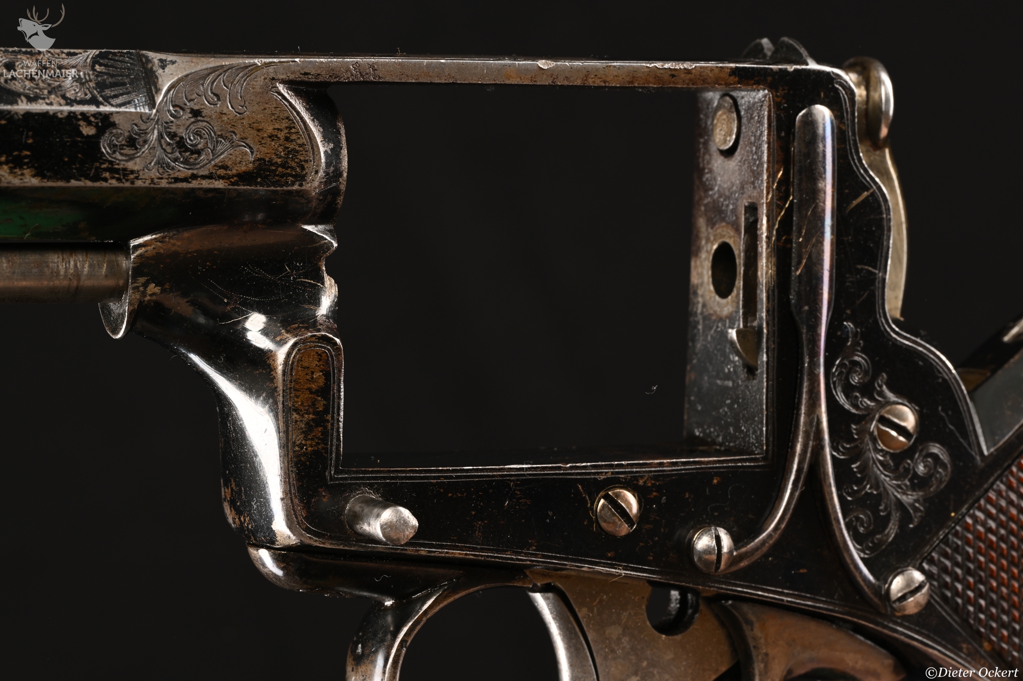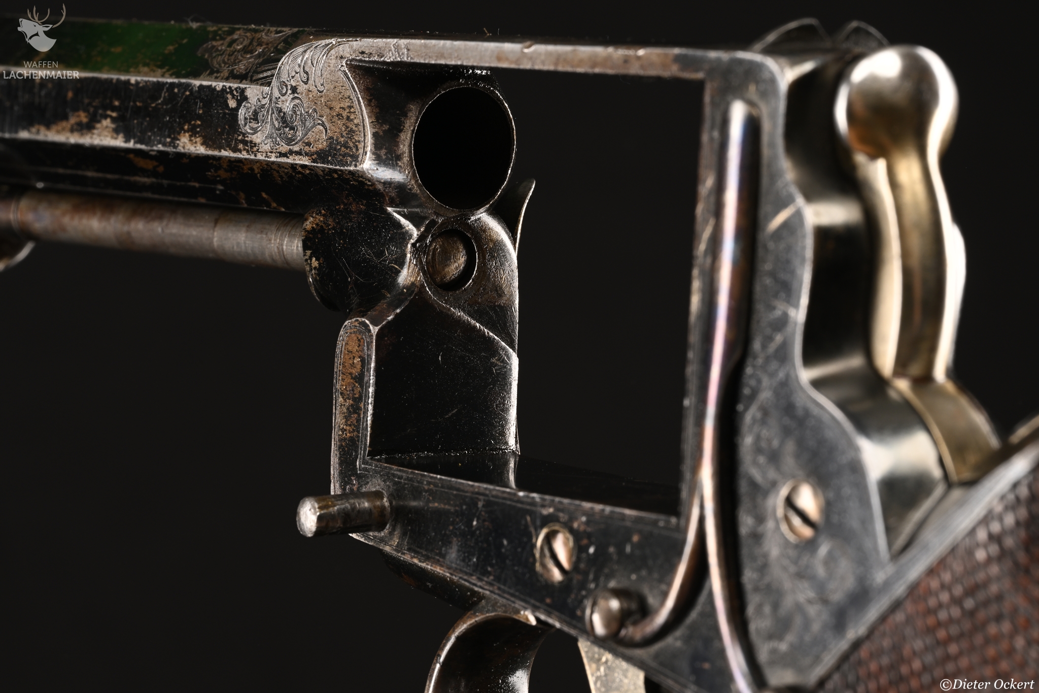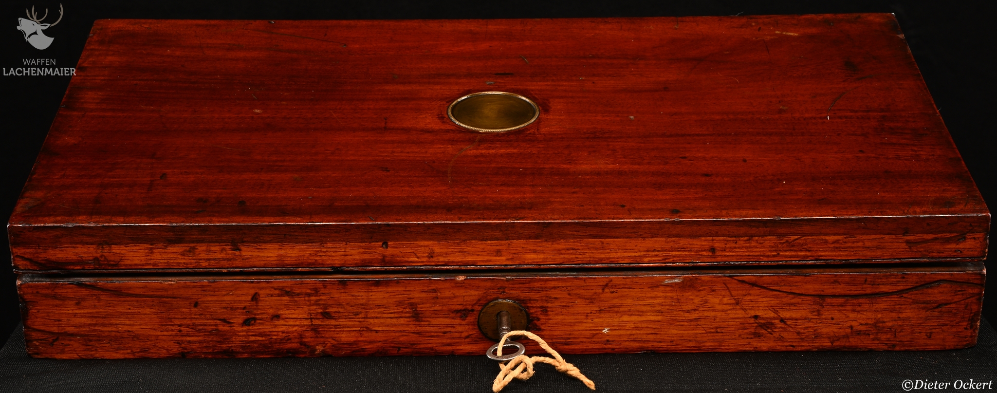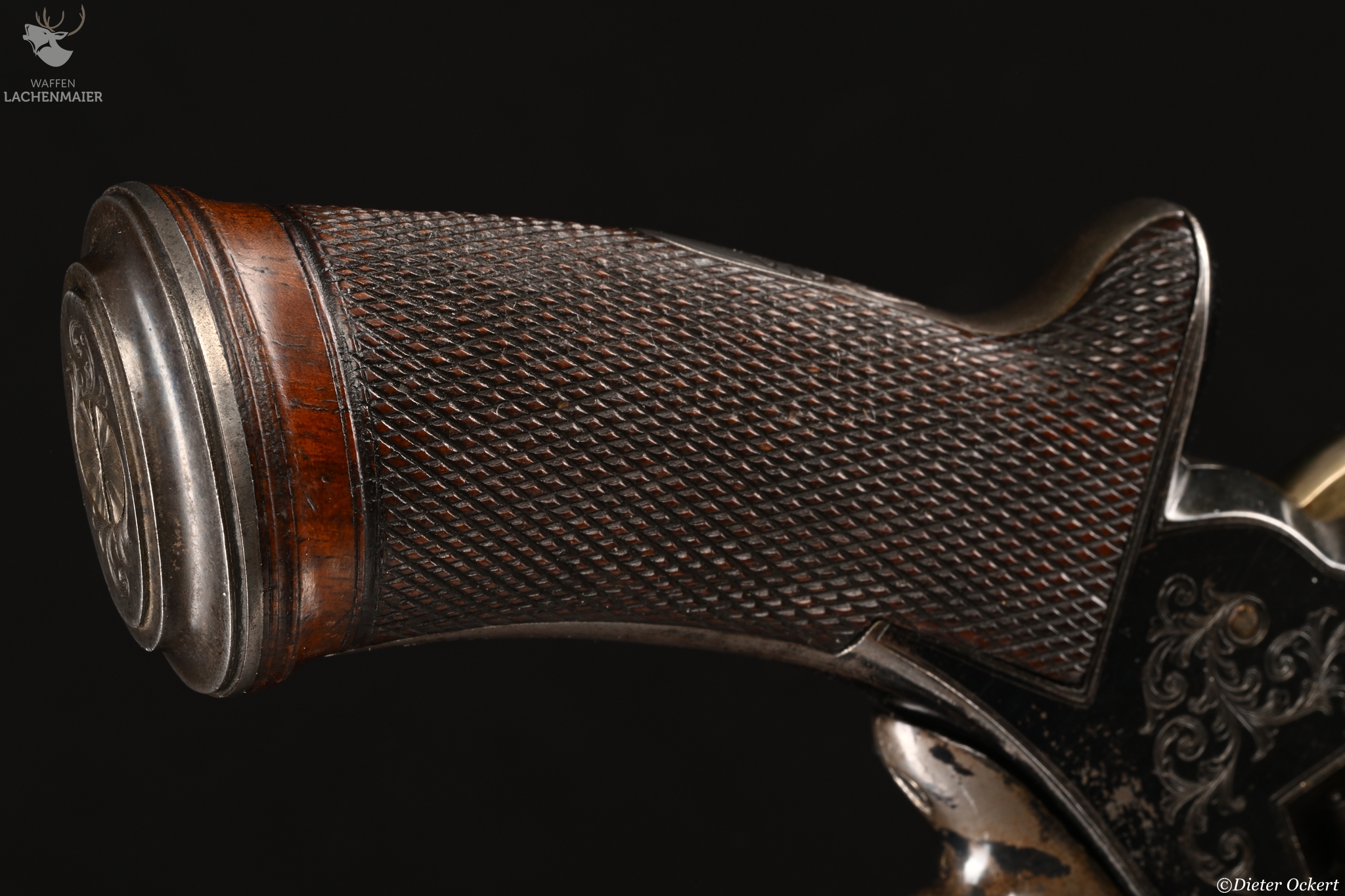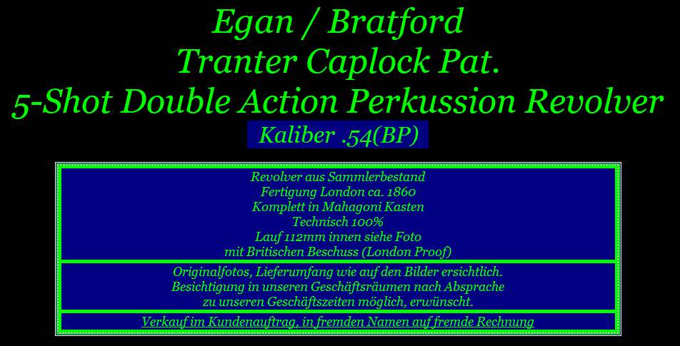 A FINE CASED 54-BORE TRANTER PATENT SECOND MODEL FIVE-SHOT DOUBLE-TRIGGER PERCUSSION REVOLVER RETAILED BY EGAN, BRADFORD serial no. 4191, 11 3/4in. overall, with blued octagonal sighted barrel engraved with a band of foliage at the muzzle, border engraved case-hardened cylinder, blued top-strap signed 'EGAN. BRADFORD', scroll engraved blued frame and trigger-guard, chequered walnut butt, scroll engraved case-hardened pommel, detachable Tranter patent rammer, and much original blued finish, London proof marks, in original lined and fitted mahogany case with accessories including brass double-cavity bullet mould (numbered '4414'), powder-flask and brass-mounted ebony cleaning rod with worm, the lid with William Egan trade label, the exterior with circular brass escutcheon.