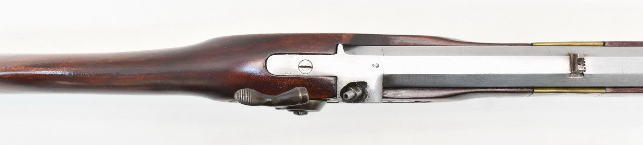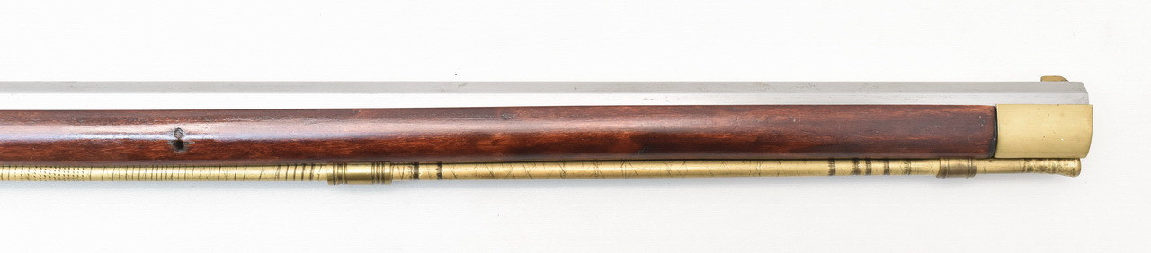 1267mm langes und 3660g schweres Vorderlader - Gewehr mit Perkussionszündung im amerikanischen LONG RIFLE / Kentucky Style. Weißfertiger, 870mm langer und gezogener Achtkantlauf mit Ulmer Beschuß 1975. 330mm lange Schäftung für Rechts- und Linksschützen ( Schaftlänge gemessen vom Abzug bis Mitte Schaftkappe ). Ladestock und Beschlagteile aus Messing. Laufhaltestift fehlt. Das ( Baukasten ? ) Gewehr scheint ungeschossen; Handhabungs- und Lagerungsspuren sind vorhanden. Details siehe Bilder.