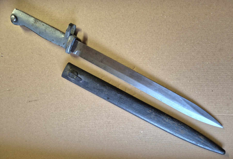 Deutsches Notbajonett (EB 29) aus dem 1.Weltkrieg mit passender Scheide. Diese Modelle mit einem Gusseisengriff und einer Klinge ohne Hohlkehle taucht nicht sehr oft auf dem Markt im guten Zustand auf und dürften in den meisten Sammlungen fehlen. Das Stück ist unbefummelt und die Klinge ist ein Traum und wurde nicht beschliffen. Der Griff besitzt noch größtenteils seiner originalen grau-blauen Farbe. Es lässt sich problemlos aufpflanzen und der Trücker geht. Zustand siehe Bilder, bei Fragen einfach melden. Versand in restliche EU 20,00Euro