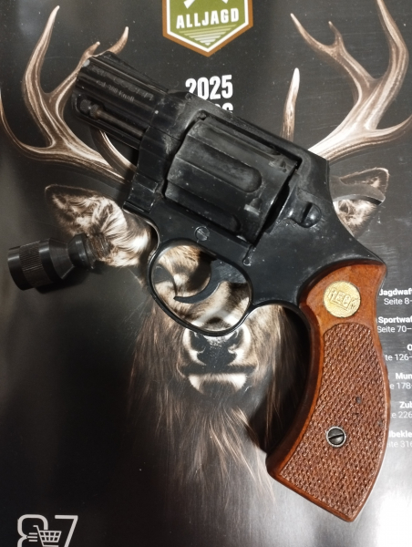Zuverlässiger sechs schüßiger Revolver im Kaliber 9mm R.K.Gelungener Nachbau des "Colt Detective" 38Special.Gute alte Reck Qualität.Kleiner Trommelspalt,realistische Mündung mit weit innenliegender Laufsperre.Angenemer double action Abzug.Natürlich läßt sich die Waffe auch im single action modus schießen.Ein Abschußbecher für Signalmunition gehört dazu.