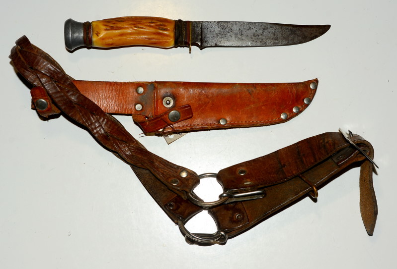Dolch mit Bowieklinge und Kunststoffgriff in Form eines Geweihgriffes, Klingenlänge 12,5 cm, die Klinge fleckig, mit Lederscheide und altem ledernen Flechtgürtel in Jugendgröße, ich vermute 1950er Jahre