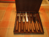 Sechs Bestecke = Messer 24 cm und Gabel 21 cm mit glatten Holzgriffen 11 cm. Von Holz gehe ich wegen der Optik und des Alters aus. Gemarkt Artur Schnittert, Solingen-Ohligs, Hartcrom steht unter einem Kreis der eine Abbildung beinhaltet. Wegen der Holzgriffe für Naturliebhaber geeignet..
