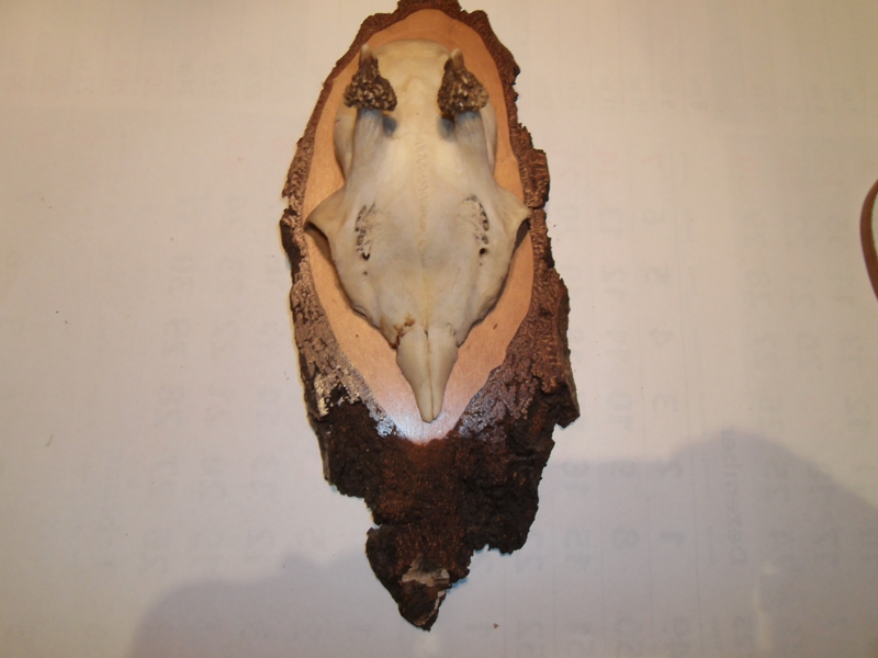 Abmessungen Brett: Höhe 24 cm, Breite 10 cm. Verklebung hat sich gelöst und die Befestigung des Schädels muss vom Käufer selbst neu vorgenommen werden ggf. mit Heißklebepistole.