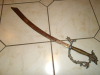 Osmanischer Krummsäbel, Länge 66 cm, Breite 3,3 cm, Stärke 3 mm. Die Klinge ist verrostet und auf beiden Seiten stumpf. In der Mitte der Klinge befindet sich beidseitig ein Zierband 16 cm lang mit Blumen und Ornamente. In dessen Mitte ist ein Bascinet mit Klappvisier abgebildet. Links und rechts von der Verzierung ist ein 4 mm starkes Loch in der Mitte der Klinge. Der Griff ist locker, lässt sich drehen und der unten am Griff angesetzte Zierboden ist deshalb auch nicht fest, daher für einen geschickten Bastler geeignet. Zur Dekoration oder für die nächste Themenpartie.