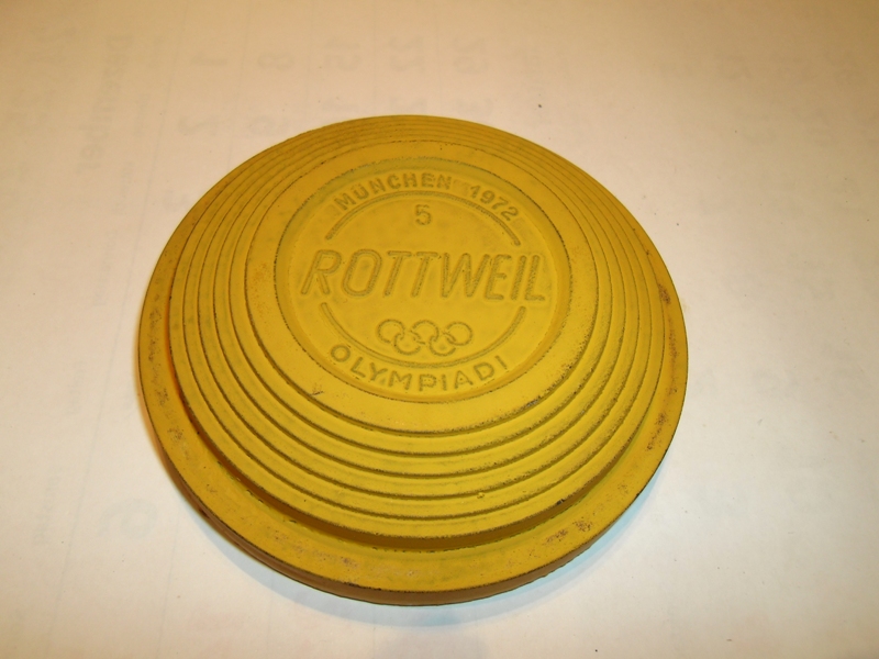 Tontaube ockergelb in der Mitte des Mittelkreises ROTTWEIL Oben München 1972 darunter Halbkreis und die 5. Unten Olympiadi darüber Halbkreis und die Olympischen Ringe. Innen schwarz mit Eindruck „PATENT“ in der Mitte. Durchmesser 11 cm. Guter Zustand, nur einige gelbe Flecke im schwarzen Bereich.