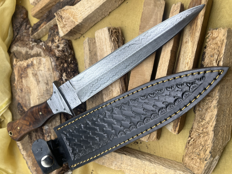 Über 200 Lagen Damast • 7,5" Klinge • 4,5" Griff • Walnussholzgriff • Damast-Parierstange • Dolchmesser • Inklusive Scheide