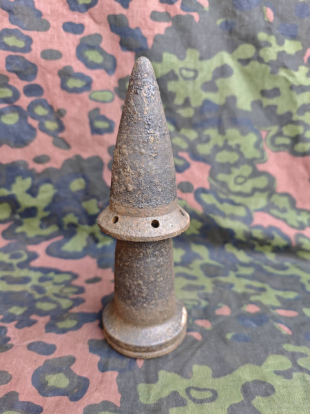 Der Granatenkörper zeigt alters- und fundtypische Korrosion, insgesamt jedoch ein sehr schönes, authentisches Erscheinungsbild.