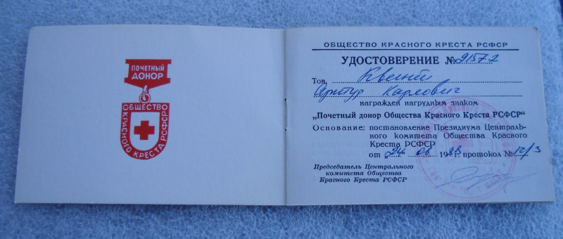UdSSR - URKUNDE - 100% ORIGINAL EHRENSPENDER DES ROTEN KREUZES - RSFSR