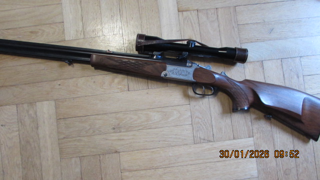 Bay. Backe, leichter Schweinsrücken, Spannschieber auf dem Kolbenhals (1-Schloss-System), Basküle aus Stahl mit Gravur, Riemenbügelösen, absolut dichter und fester Verschluss, gültiger Beschuss ist vorhanden (kein Stahlschrotbeschuss), Schaftmagazin für 4 Kugelpatronen.