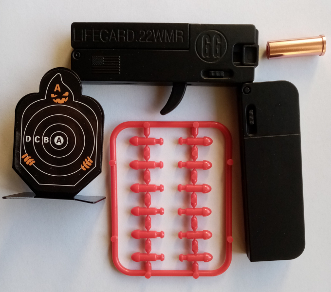 mit 12 Plastikgeschossen, 1 Ladehülse und 1 Zielscheibe.