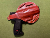 Pancake Formholster, mit 3 Gürtelschlitzen die die Möglichkeit die Waffe auf 2 Winkel zu tragen bieten. Es besteht aus hochwertigem, dicken Braunleder, Rechtshand, ist offen am Lauf, mit einem Standard Druckknopfverschluss und die Gürtelschlitzen, hier auf der Rückseite sichtbar