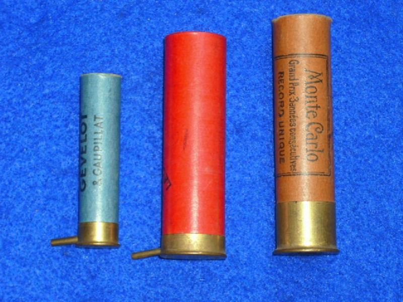 Leere Papphülsen : von Links Foto: Neu cal.12 mm Gevelot Lefaucheux- Gaupillat , Neu cal.16 Leon Beaux&C Lefaucheux, Gebraucht cal.20 Eley Monto Carlo