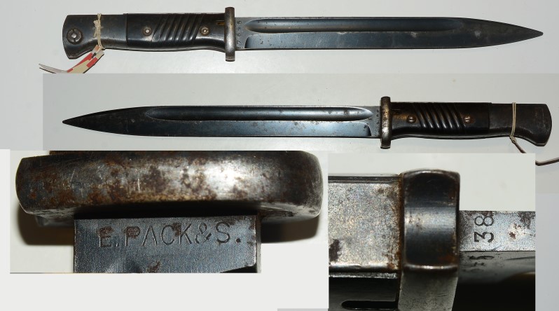 Deutsches Bajonett 84/98, 3. Art, 2. Weltkrieg, Hersteller "E.Pack&S.", einige kleine Flecken in der Brünierung ansonsten guter Zustand, die Scheide fehlt