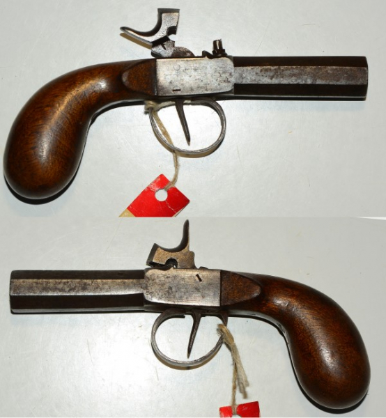 Perkussionspistole, fester Lauf, Lauflänge 2,2 cm, Gesamtlänge 16,5 cm, Kaliber 10,5 mm, technisch guter Zustand, guter Zustand und einwandfreie Funktion, kein Beschussstempel, Marke "M", nach der Hahnform wahrscheinlich französisch
