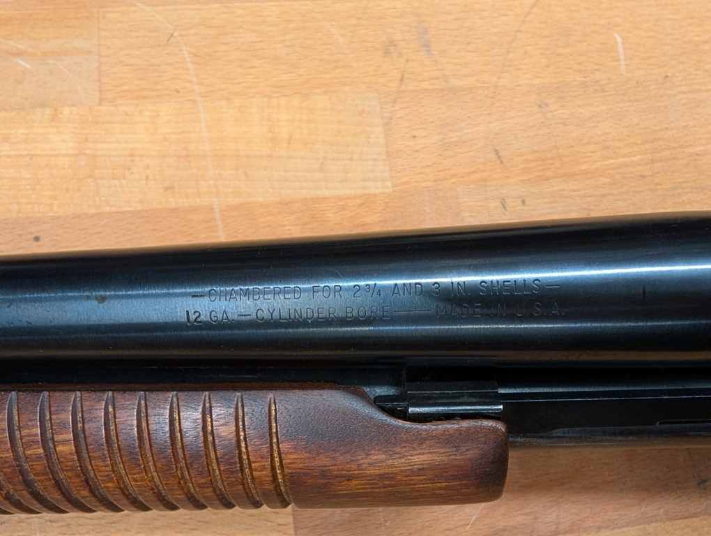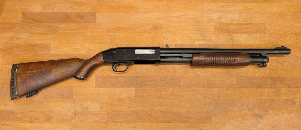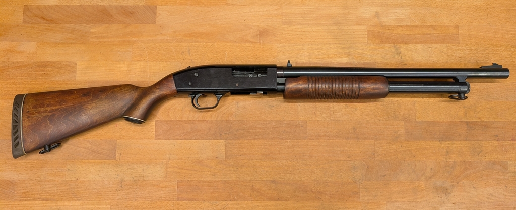 Mossberg 590 mit Holzschaft und Visierung (inkl. Klappkimme) auf dem Lauf. Kaliber 12/76