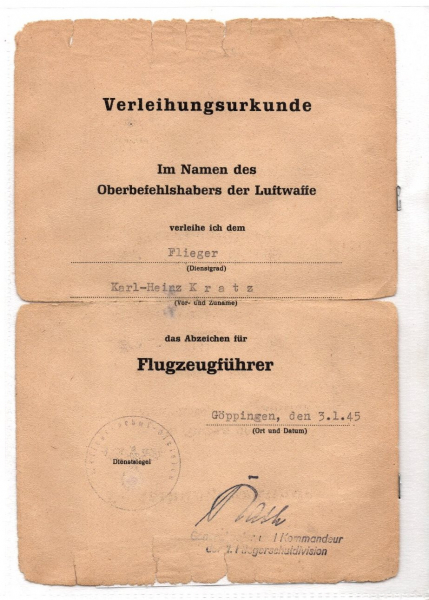 Flugzeugführer Urkunde der Luftwaffe vom 3.1.1945 für Flieger Karl-Heinz Kratz, Göppingen, 1.Fliegerschuldivision, General Major Hans Joachim Rath, einmal gefaltet, mit Randbläsuren. Versand als Einschreiben 3,50€