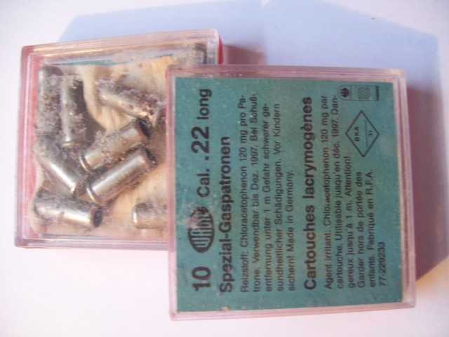 Sie werden nicht mehr oft angeboten aber es gibt sie noch ++ Aus Nachlass werden 10 Stk. (1 Packung) starke Spezial-Gaspatronen Cal. .22 long vom Hersteller WADI (Haltbarkeitsdatum 12/1997) angeboten -- Die Patronen sind noch original verpackt und waren trocken gelagert -- Die Patronen sind mit 120 mg Chloracetophenon geladen -- Die Versandkosten als Einwurf-Einschreiben betragen 5,60 € +++ Beim Kauf von 2 Packungen fallen nur 1x Versandkosten an +++ Privatverkauf, daher keine Gewährleistung, Garantie oder Rücknahme. ++ Altersnachweis/ eGun ID ist erforderlich +++ Fragen bitte mailen.