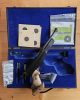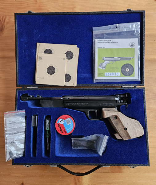 Feinwerkbau Modell 80 Luftpistole im Original Koffer mit einigem Zubehör. Sogar der Original Schraubendreher von Feinwerkbau ist noch vorhanden. Die Lupi ist im einwandfreien Zustand und funktioniert auch einwandfrei. Da sie die letzten Jahre nur rumgelegen ist, habe ich mich von der Funktion, letzte Woche bei uns im Schützenhaus überzeugt und sie kurz getestet. Lediglich das Inlay vom Koffer hat etwas gelitten und man sieht wo der Aufkleber vom Schützenverein auf dem Koffer geklebt hat (siehe Bilder).