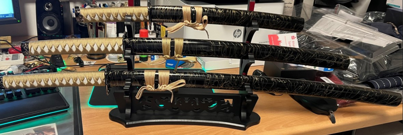 Set bestehend aus Katana, Wakizashi, Tanto und hochwertigem Holzständer mit rotem Samt in den Ablagestellen.