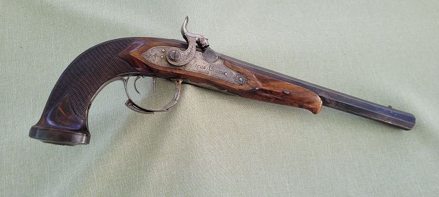 Sie bieten auf eine gute deutsche Scheibenpistole um 1840. Die Gesamtlänge beträgt ca. 39 cm, der aushakbare, original brünierte Achtkant-Lauf im Kaliber 12,5 mm gezogen ist 26 cm lang und hat eine starre Visiereinrichtung mit Kimme und Korn. Das Schloss mit dem fein einstellbaren Stecher ist „JACOB MUSICH“ signiert. Die glatte Garnitur hat einen klapp- baren Fingerhaken. Hahn und Schlossplatte sind zart graviert. Der Schaft aus bestem Nussholz ist mit 1 (von einem Paar) bezeichnet und mit einer feinen Fischhaut versehen.