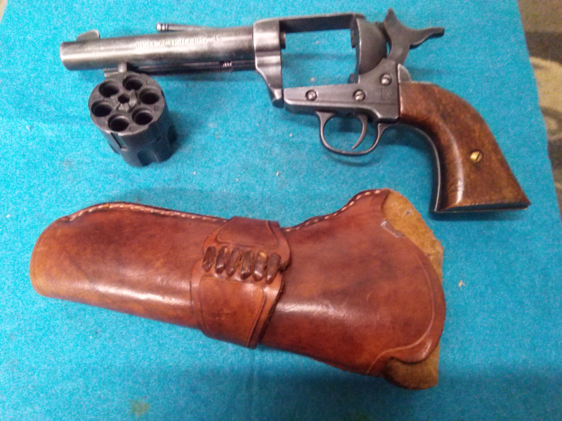 Hallo biete einen Revolver Modell von KOLSTER.MIT HOLSTER AUS LEDER.ES KÖNNEN 209ZÜNDER DAMIT VERSCHOSSEN WERDEN.MIT 5HÜLSEN.