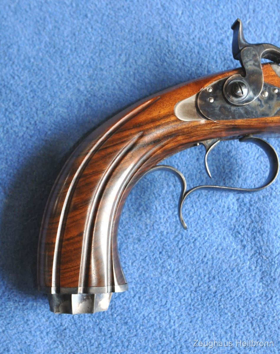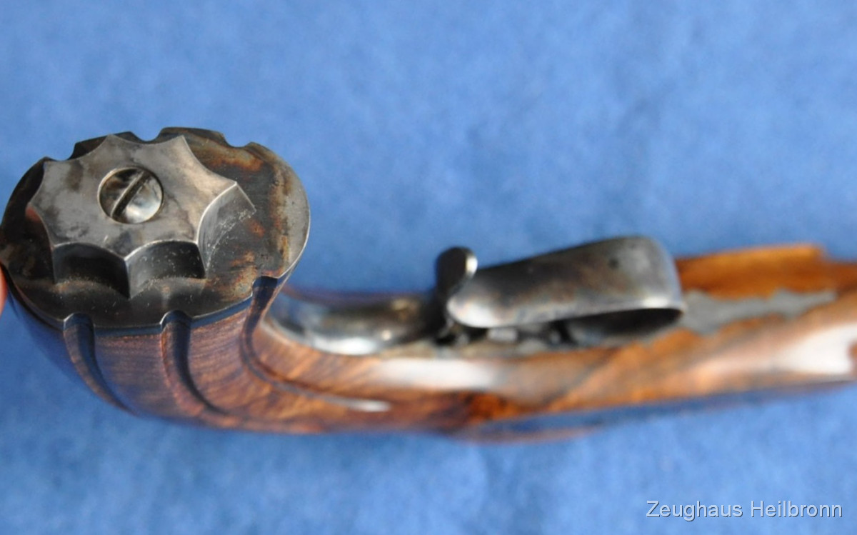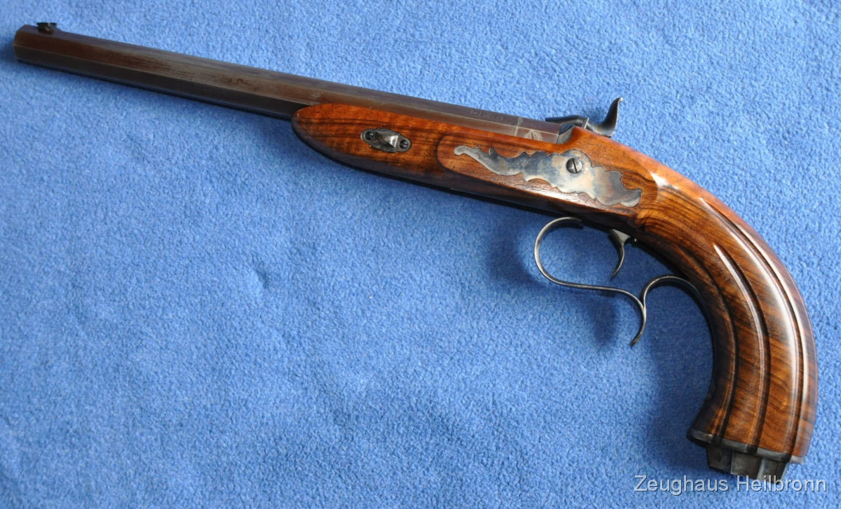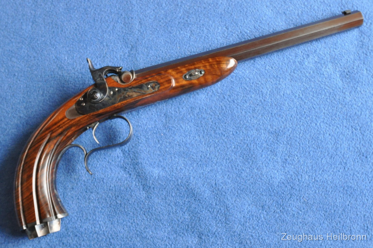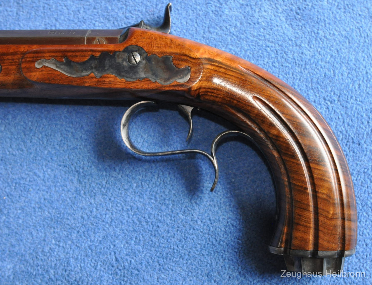 Der ausgezeichnete Nachbau dieser Scheibenpistole, dessen Original Modell um 1854-1855 produziert wurde, ist zweifelsfrei das Meisterstück unserer Produktion. Die Pistole hat einen verstellbaren Stecher und ein höhenverstellbares Visier und ist daher die ideale Pistole für den Wettkampfschützen. Der Lauf ist bräuniert und trägt die Inschrift BARTH. IOS KUCHENREUTER sowie ein silbernes Inlay mit der Kuchenreuter Marke. Der gemaserte Nußbaumschaft hat ein Ölfinish. Alle Metallteile sind buntgehärtet.