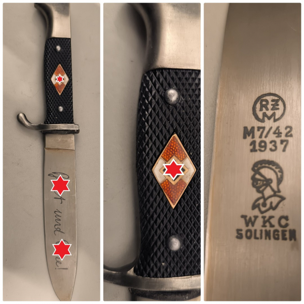 Zum Verkauf kommt dieses gebrauchte, tolle Fahrtenmesser im guten Zustand, von dem Blankwaffenhersteller WKC RZM M7/42 1937 aus SOLINGEN. Es befindet sich in einem zeitgemäß guten Zustand mit Gebrauchsspuren, da es ja auch genutzt wurde. Die Klinge hat leichte Patina. Devise und Hersteller sind noch gut lesbar. Raute ist leicht beweglich. Die Bilder sind Bestandteil dieser Auktion. Ohne Scheide. Privatverkauf, ohne Gewährleistung, Rücknahme und Garantie.