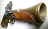 Sehr dekorative Steinschloß-Pistole mit trichterförmig erweitertem Messing-Deko-Lauf. Der Lauf geht von Achtkant auf rund über. Die Pistole ist ca. 30 cm lang und wiegt rund 1020 Gramm. Ladestock, Abzug, Schloß und Gegenplatte sind aus Stahl (magnetisch), Abzugsbügel, Schaftkappe und Lauf aus Messing. Der Hahn rastet zweimal, die Feder ist in der ersten Rast etwas schwach. Die Pistole hat keinerlei Stempel, Gravuren oder Beschriftungen, sie ist nicht schußfähig, sondern ausschließlich zu Dekorationszwecken gebaut!
